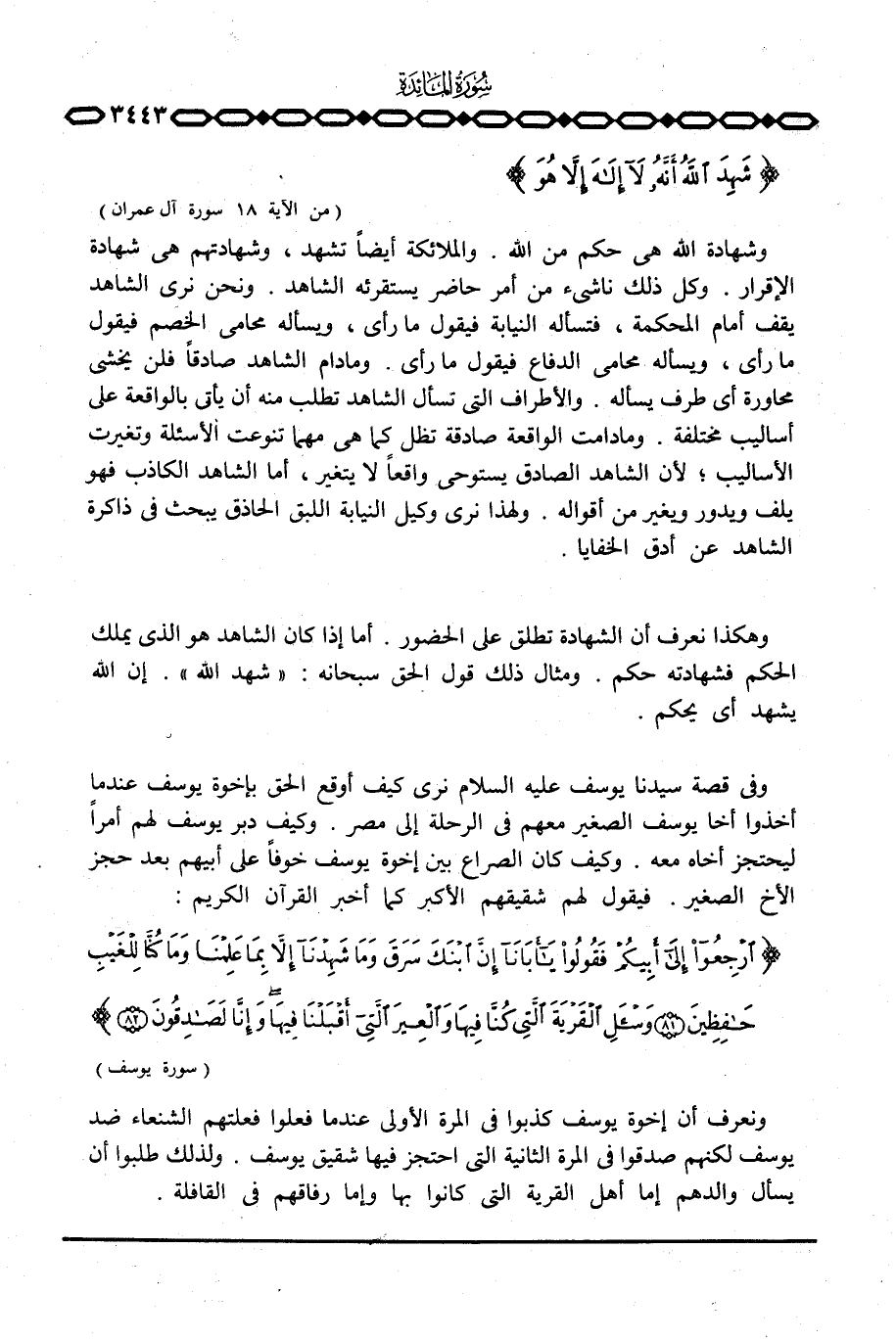 وشهادة الله هي حكم من الله. والملائكة أيضاً تشهد، وشهادتهم هي شهادة الإقرار. وكل ذلك ناشئ من أمر حاضر يستقرئه الشاهد. ونحن نرى الشاهد يقف أمام المحكمة، فتسأله النيابة فيقول ما رأى، ويسأله محامي الخصم فيقول ما رأى، ويسأله محامي الدفاع فيقول ما رأى. وما دام الشاهد صادقا فلن يخشى محاورة أي طرف يسأله. والأطراف التي تسأل الشاهد تطلب منه أن يأتي بالواقعة على أساليب مختلفة. وما دامت الواقعة صادقة تظل كما هي مهما تنوعت الأسئلة وتغيرت الأساليب؛ لأن الشاهد الصادق يستوحي واقعاً لا يتغير، أما الشاهد الكاذب فهو يلف ويدور ويغير من أقواله. ولهذا نرى وكيل النيابة اللبق الحاذق يبحث في ذاكرة الشاهد عن أدق الخفايا.