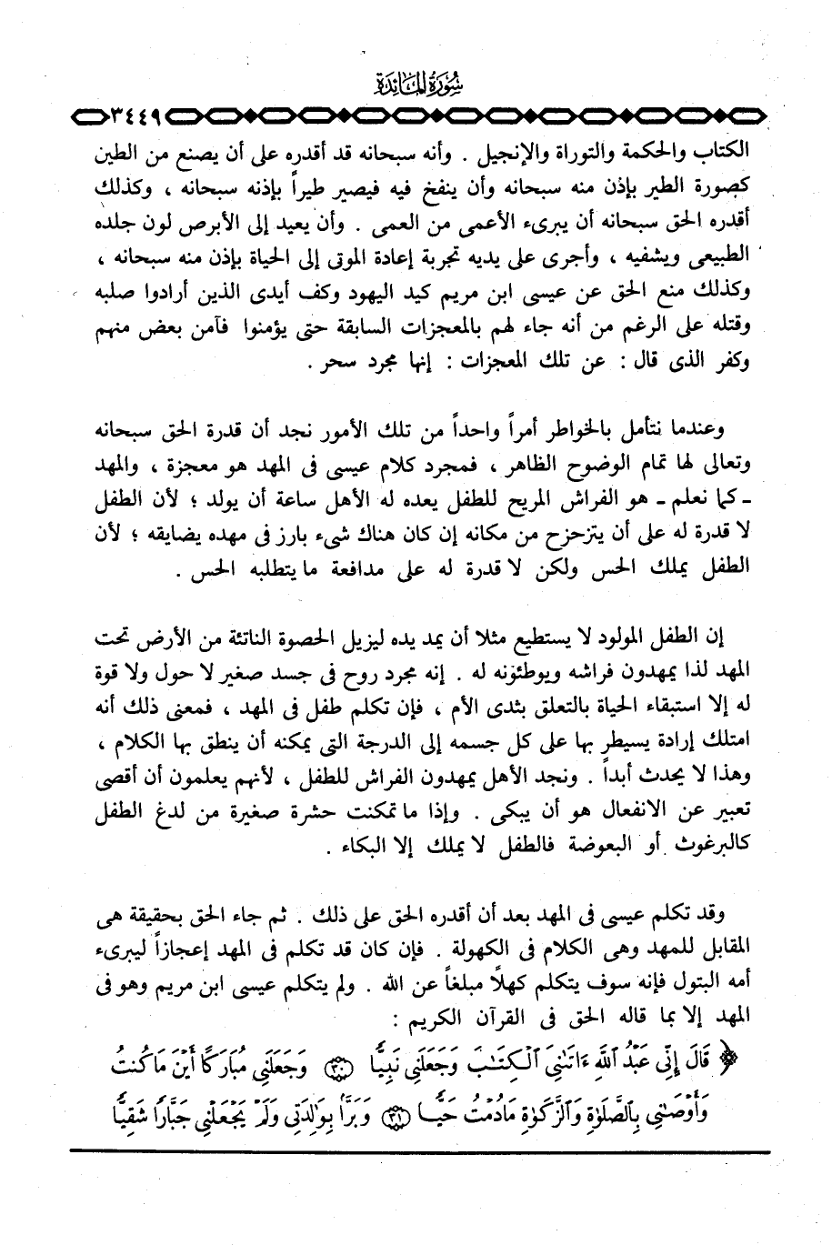 الكتاب والحكمة والتوراة والإنجيل. وأنه سبحانه قد أقدره على أن يصنع من الطين كصورة الطير بإذن منه سبحانه وأن ينفخ فيه فيصير طيراً بإذنه سبحانه، وكذلك أقدره الحق سبحانه أن يبرئ الأعمى من العمى. وأن يعيد إلى الأبرص لون جلده الطبيعي ويشفيه، وأجرى على يديه تجربة إعادة الموتى إلى الحياة بإذن منه سبحانه، وكذلك منع الحق عن عيسى ابن مريم كيد اليهود وكف أيدي الذين أرادوا صلبه وقتله على الرغم من أنه جاء لهم بالمعجزات السابقة حتى يؤمنوا فآمن بعض منهم وكفر الذي قال: عن تلك المعجزات: إنها مجرد سحر.