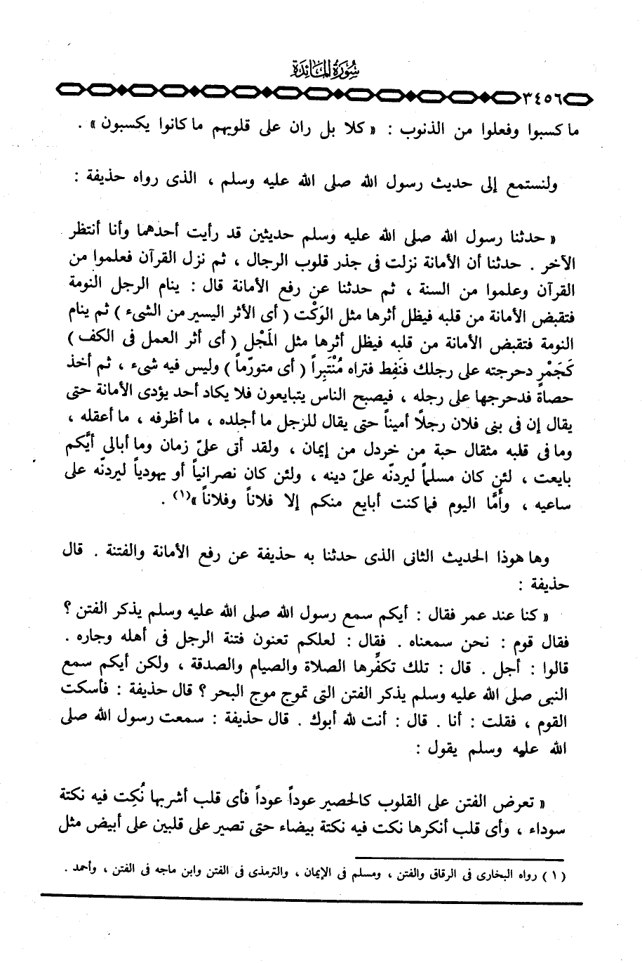 » تعرض الفتن على القلوب كالحصير عوداً عوداً فأي قلب أشربها نُكِت فيه نكتة سوادء، وأي قلب أنكرها نكت. فيه نكتة بيضاء حتى تصير على قلبين على أبيض مثل