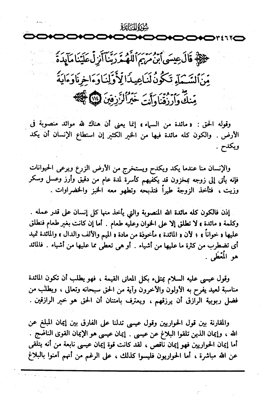 وقول عيسى عليه السلام يمتلئ بكل المعاني القيمة، فهو يطلب أن تكون المائدة مناسبة لعيد يفرح به الأولون والآخرون وآية من الحق سبحانه وتعالى، ويطلب من فضل ربوبية الرازق أن يرزقهم، ويعترف بامتنان أن الحق هو خير الرازقين.