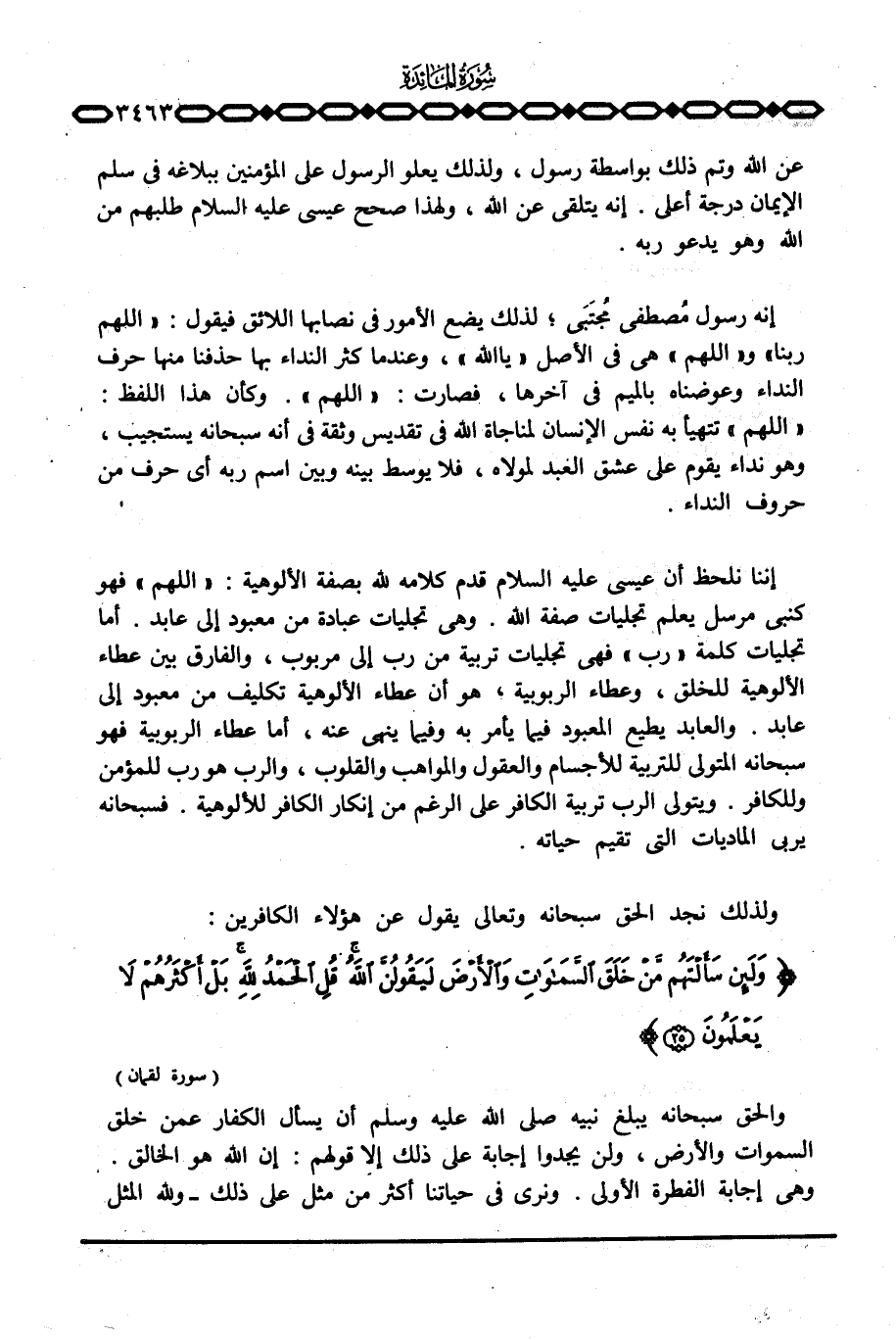 إننا نلحظ أن عيسى عليه السلام قدم كلامه لله بصفة الألوهية: «اللهم» فهو كنبي مرسل يعلم تجليات صفة الله. وهي تجليات عبادة من معبود إلى عابد. أما تجليات كلمة «رب» فهي تجليات تربية من رب إلى مربوب، والفارق بين عطاء الألوهية للخلق، وعطاء الربوبية، هو أن عطاء الألوهية تكليف من معبود إلى عابد.