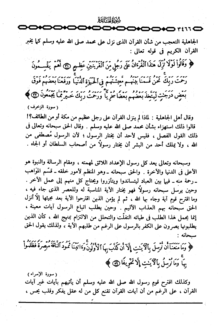 الجاهلية التعجب من شأن القرآن الذي نزل على محمد صَلَّى اللَّهُ عَلَيْهِ وَسَلَّم َ كما يخبر القرآن الكريم في قوله تعالى: {وَقَالُواْ لَوْلاَ نُزِّلَ هذا القرآن على رَجُلٍ مِّنَ القريتين عَظِيمٍ أَهُمْ يَقْسِمُونَ رَحْمَتَ رَبِّكَ نَحْنُ قَسَمْنَا بَيْنَهُمْ مَّعِيشَتَهُمْ فِي الحياة الدنيا وَرَفَعْنَا بَعْضَهُمْ فَوْقَ بَعْضٍ دَرَجَاتٍ لِّيَتَّخِذَ بَعْضُهُم بَعْضاً سُخْرِيّاً وَرَحْمَتُ رَبِّكَ خَيْرٌ مِّمَّا يَجْمَعُونَ} [الزخرف: 31 - 32] .