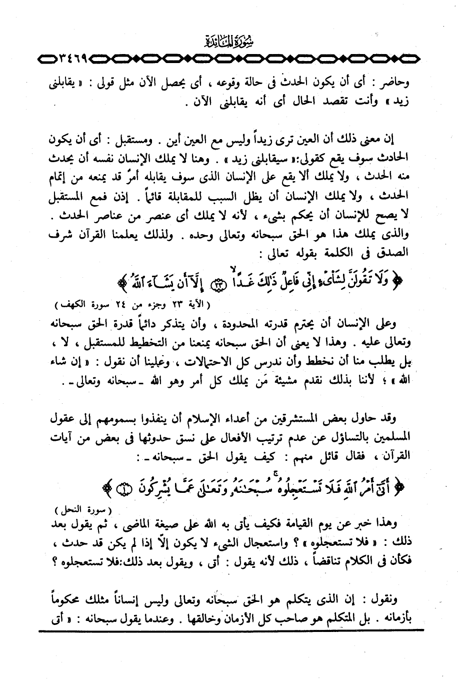 إن معنى ذلك أن العين ترى زيداً وليس مع العين أين. ومستقبل: أي أن يكون الحادث سوف يقع مقولي: «سيقابلني زيد» . وهنا لا يملك الإنسان نفسه أن يحدث منه الحدث، ولا يملك ألا يقع على الإنسان الذي سوف يقابله أمرٌ قد يمنعه من إتمام الحدث، ولا يملك الإنسان أن يظل السبب للمقابلة قائماً. إذن فمع المستقبل لا يصح للإنسان أن يحكم بشيء، لأنه لا يملك أي عنصر من عناصر الحدث. والذي يملك هذا هو الحق سبحانه وتعالى وحده. ولذلك يعلمنا القرآن شرف الصدق في الكلمة بقوله تعالى: {وَلاَ تَقْولَنَّ لِشَيْءٍ إِنِّي فَاعِلٌ ذلك غَداً إِلاَّ أَن يَشَآءَ الله} [الكهف: 23 - 24] .