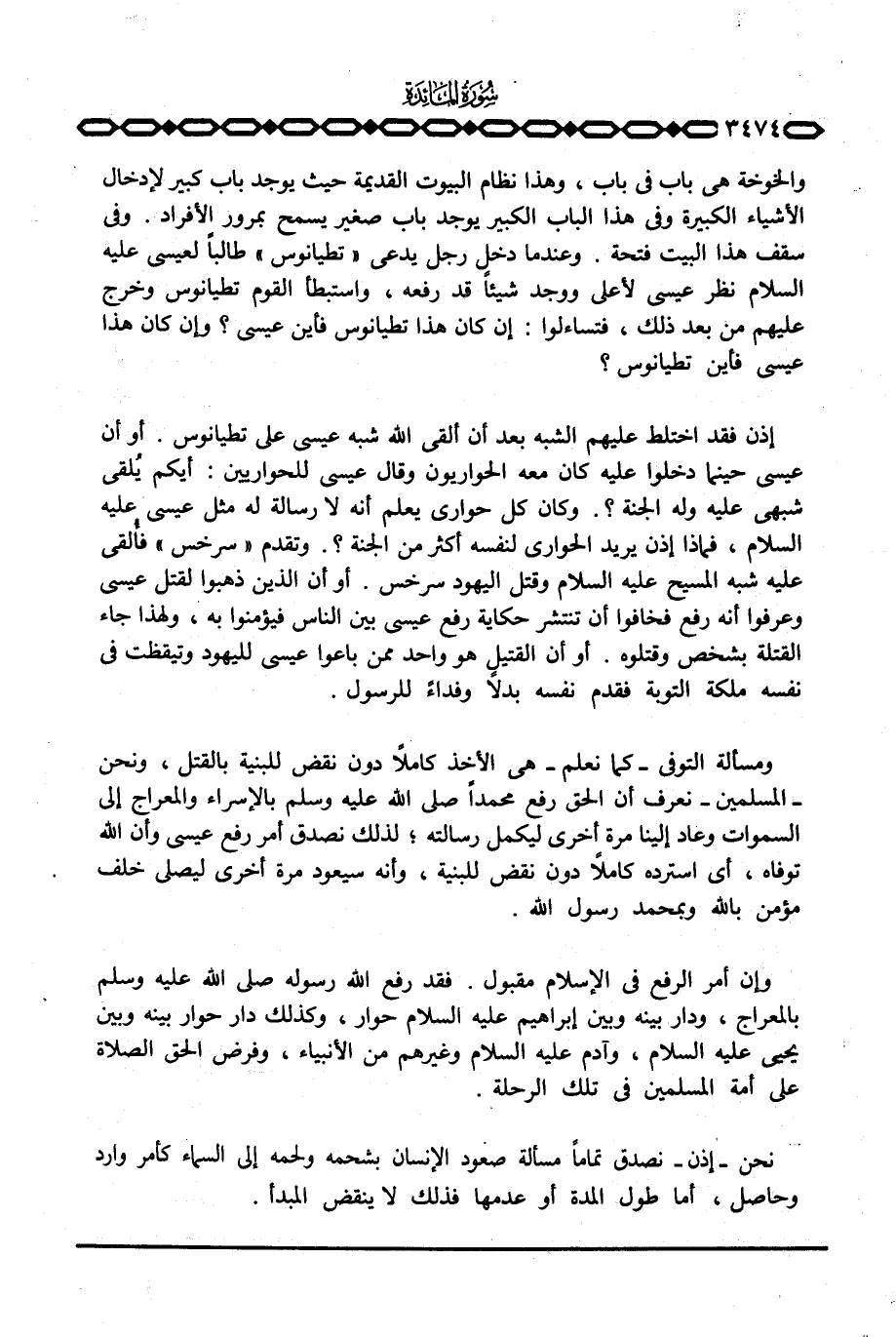 ومسألة التوفي - كما نعلم - هي الأخذ كاملاً دون نقض للبنية بالقتل، ونحن - المسلمين - نعرف أن الحق رفع محمداً صَلَّى اللَّهُ عَلَيْهِ وَسَلَّم َ بالإسراء والمعراج إلى السموات وعاد إلينا مرة أخرة ليكمل رسالته؛ لذلك نصدق أمر رفع عيسى وأن الله توفاه، أي استرده كاملاً دون نقض للبنية، وأنه سيعود مرة أخرى ليصلي خلف مؤمن بالله وبمحمد رسول الله.