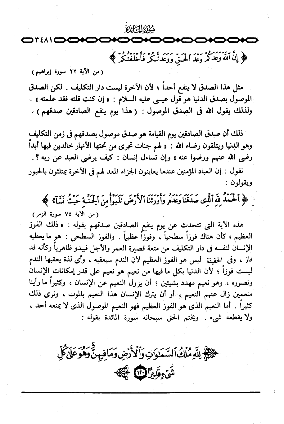 مثل هذا الصدق لا ينفع أحداً؛ لأن الآخرة ليست دار التكليف. لكن الصدق الموصول بصدق الدنيا هو قول عيسى عليه السلام: {إِن كُنتُ قُلْتُهُ فَقَدْ عَلِمْتَهُ} . ولذلك يقول الله في الصدق الموصول: {هذا يَوْمُ يَنفَعُ الصادقين صِدْقُهُمْ} .