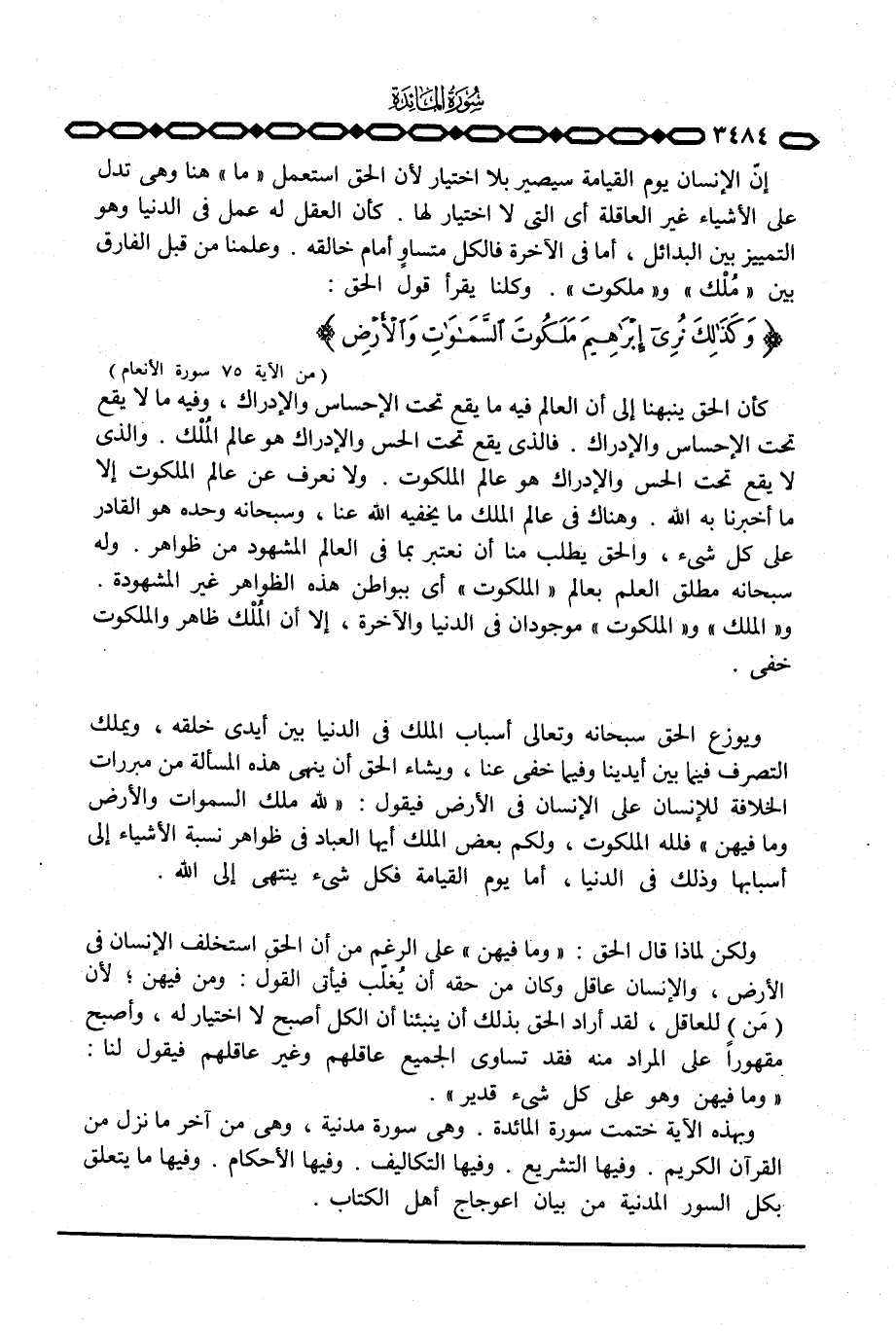 وبهذه الآية ختمت سورة المائدة. وهي سورة مدنية، وهي من آخر ما نزل من القرآن الكريم، وفيها التشريع. وفيها التكاليف. وفيها الأحكام. وفيها ما يتعلق بكل السور المدنية من بيان اعوجاج أهل الكتاب.