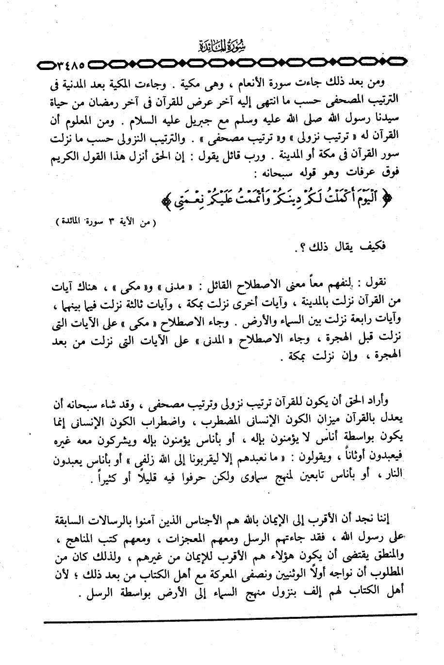 ومن بعد ذلك جاءت سورة الأنعام، وهي مكية. وجاءت المكية بعد المدنية في الترتيب المصحفي حسب ما انتهى إليه آخر عرض للقرآن في آخر رمضان من حياة سيدنا رسول الله صَلَّى اللَّهُ عَلَيْهِ وَسَلَّم َ مع جبريل عليه السلام. ومن المعلوم أن القرآن له «ترتيب نزولي» و «ترتيب مصحفي» . والترتيب النزولي حسب ما نزلت سورة القرآن في مكة أو المدنية. ورب قائل يقول: إن الحق أنزل هذا القول الكريم فوق عرفات وهو قوله سبحانه: {اليوم أَكْمَلْتُ لَكُمْ دِينَكُمْ وَأَتْمَمْتُ عَلَيْكُمْ نِعْمَتِي} [المائدة: 3] .