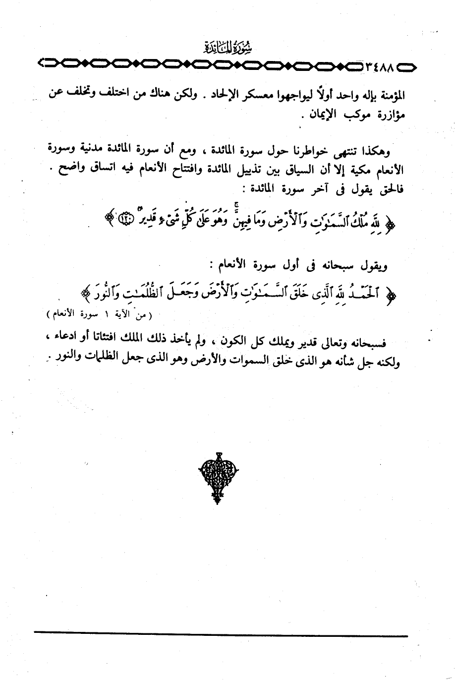 وهكذا تنتهي خواطرنا حول سورة المائدة، ومع أن سورة المائدة مدنية وسورة الأنعام مكية إلا أن السياق بين تذييل المائدة وافتتاح الأنعام فيه اتساق واضح. فالحق يقول في آخر سورة المائدة: {للَّهِ مُلْكُ السماوات والأرض وَمَا فِيهِنَّ وَهُوَ على كُلِّ شَيْءٍ قَدِيرٌ}