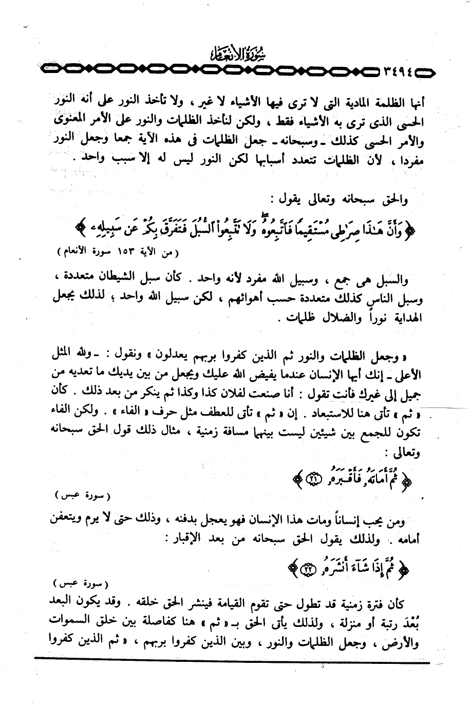 أنها الظلمة المادية التي لا ترى فيها الأشياء لا غير، ولا تأخذ النور على أنه النور الحسي الذي ترى به الأشياء فقط، ولكن لنأخذ الظلمات والنور على الأمر المعنوي والأمر الحسي كذلك - وسبحانه - جعل الظلمات في هذه الآية جمعا وجعل النور مفردا، لأن الظلمات تتعدد أسبابها لكن النور ليس له إلا سبب واحد.