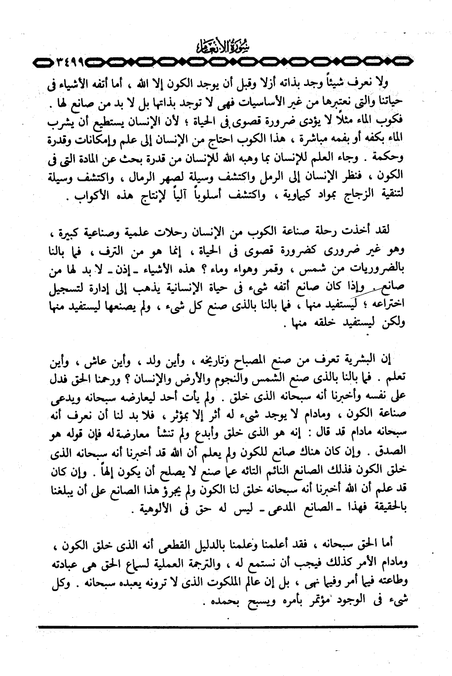 لقد أخذت رحلة صناعة الكوب من الإنسان رحلات علمية وصناعة كبيرة، وهو غير ضروري كضرورة قصوى في الحياة، إنما هو من الترف، فما بالنا بالضروريات من شمس، وقمر وهواء وماء؟ هذه الأشياء - إذن - لا بد لها من صانع وإذا كان صانع أتفه شيء في حياة الإنسانية يذهب إلى إدارة لتسجيل اختراعه؛ ليستفيد منها، فما بالنا بالذي صنع كل شيء، ولم يصنعها ليستفيد منها ولكن ليستفيد خلقه منها.