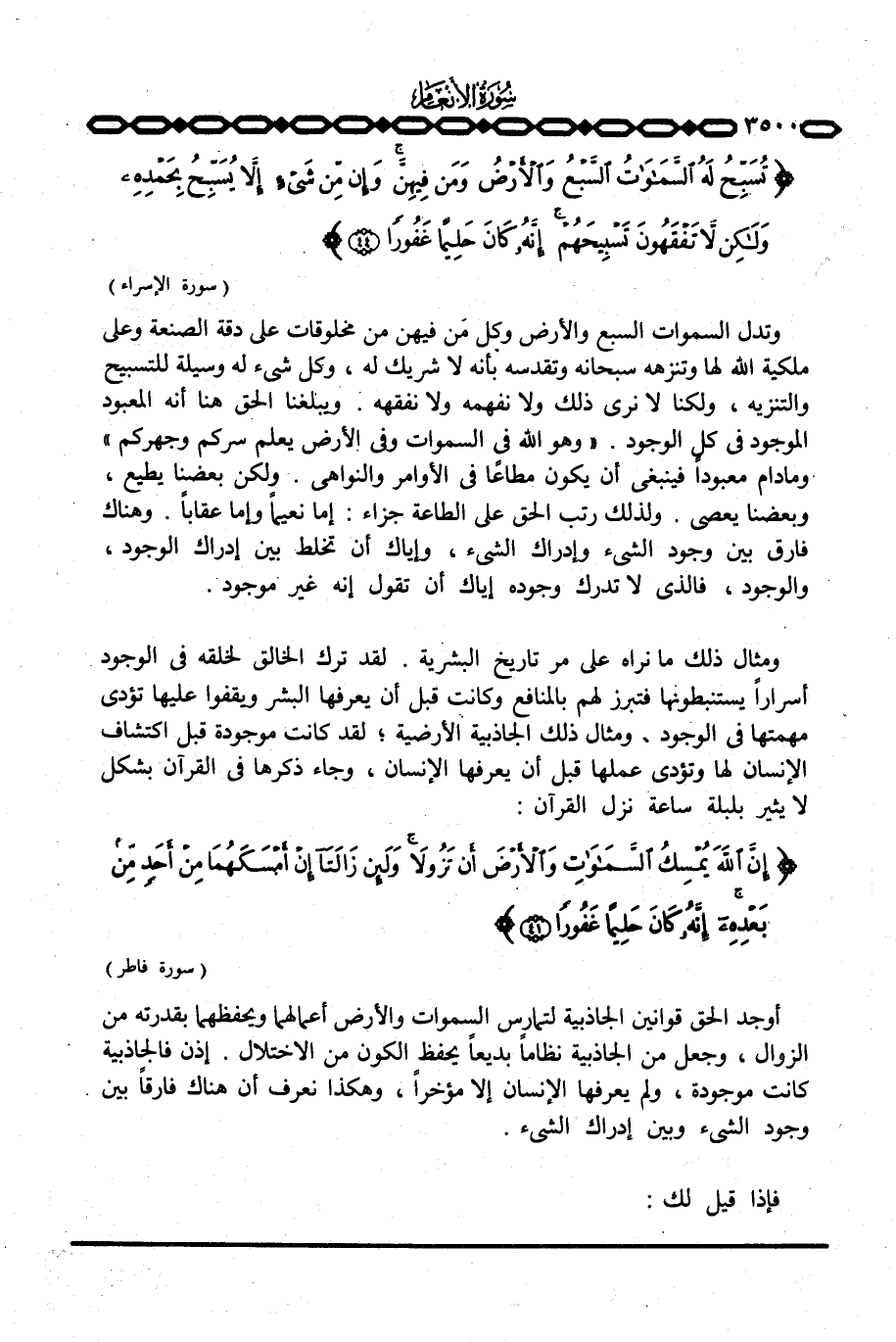 أوجد الحق قوانين الجاذبية لتمارس السموات والأرض أعمالها ويحفظهما بقدرته من الزوال، وجعل من الجاذبية نظاماً بديعاً يحفظ الكون من الاختلال. إذن فالجاذبية كانت موجودة، ولم يعرفها الإنسان إلا مؤخراً، وهكذا نعرف أن هناك فارقاً بين وجود الشيء وبين إدراك الشيء.