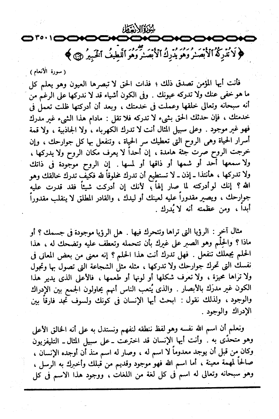 وعلى سبيل المثال أنت لا تدرك الكهرباء، ولا الجاذبية، ولا قمة أسرار الحياة وهي الروح التي تعطيك سر الحياة، وتنفعل بها كل جوارحك، وإن خرجت الروح صرت جثة هامدة، إن أحداً لا يعرف مكان الروح ولا يدركها، ولا سمعها أحد أو شمها أو ذاقها أو لمسها. إن الروح موجودة في ذاتك ولا تدركها، هأنتذا - إذن - لا تستطيع أن تدرك مخلوقاً لله فكيف تدرك خالقك وهو الله؟ إنك لو أدركته لما صار إلهاً؛ لأنك إن أدركت شيئاً فقد قدرت عليه جوارحك، ويصير مقدوراً عليه لعينك أو ليدك، والقادر المطلق لا ينقلب مقدوراً أبداً، ومن عظمته أنه لا يُدرك.