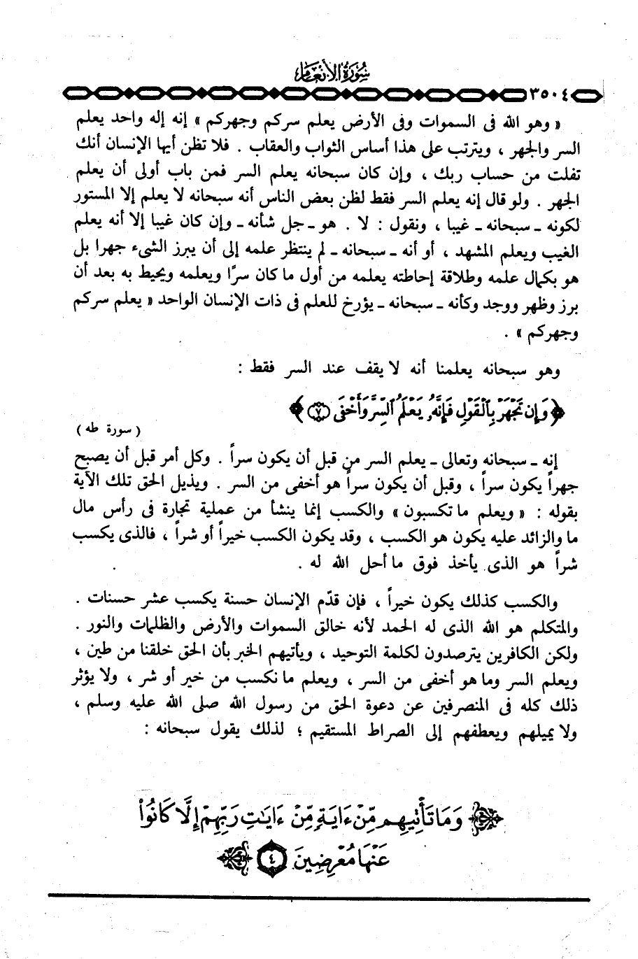 والكسب كذلك يكون خيراً، فإن قدّم الإنسان حسنة يكسب عشر حسنات. والمتكلم هو الله الذي له الحمد لأنه خالق السموات والأرض والظلمات والنور. ولكن الكافرين يترصدون لكلمة التوحيد، ويأتيهم الخبر بأن الحق خلقنا من طين، ويعلم السر وما هو أخفى من السر، ويعلم ما نكسب من خير أو شر، ولا يؤثر ذلك كله في المنصرفين عن دعوة الحق من رسول الله صَلَّى اللَّهُ عَلَيْهِ وَسَلَّم َ، ولا يميلهم ويعطفهم إلى الصراط المستقيم؛ لذلك يقول سبحانه: {وَمَا تَأْتِيهِم مِّنْ آيَةٍ ... }