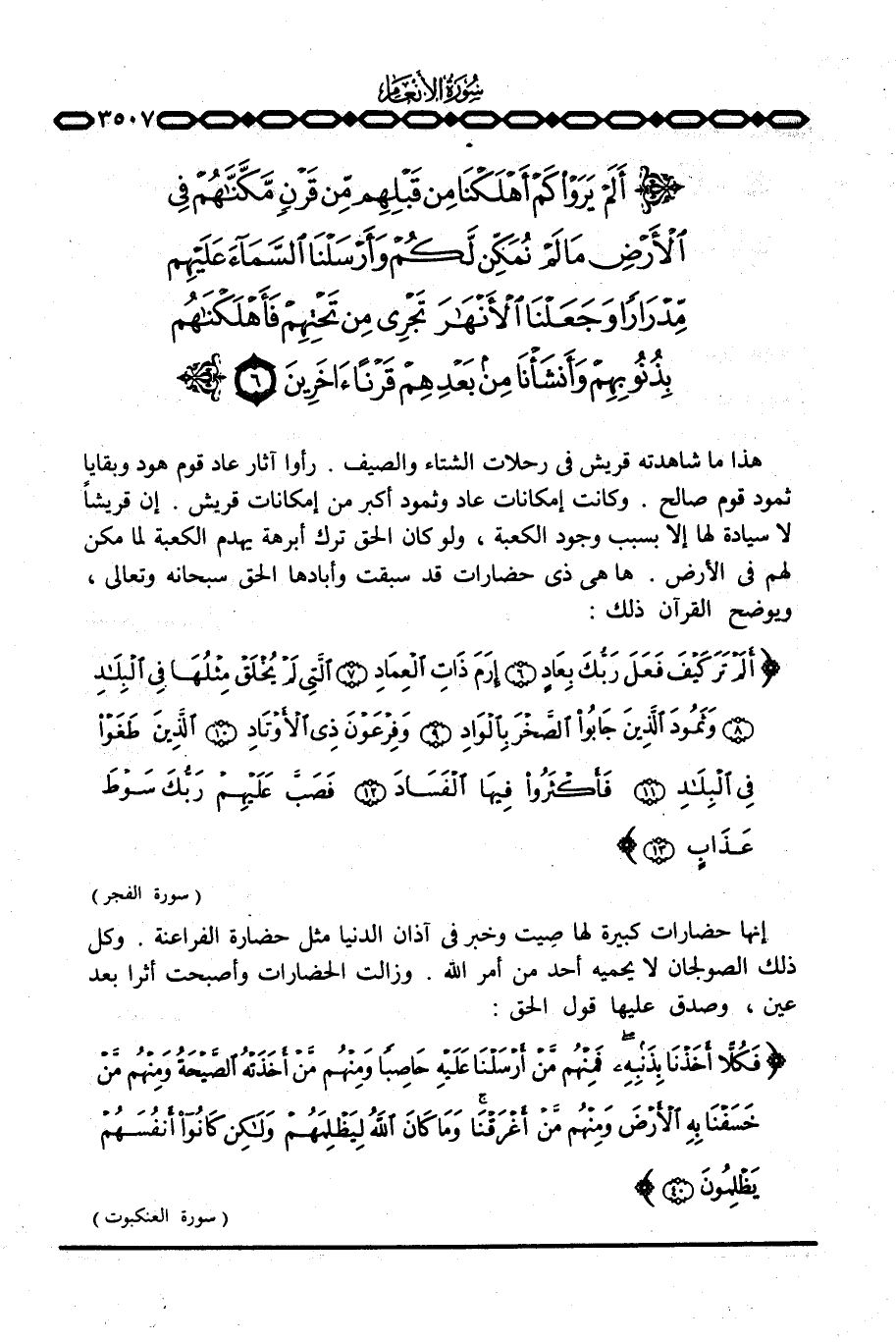 هذا ما شاهدته قريش في رحلات الشتاء والصيف. رأوا آثار عاد قوم هود وبقايا ثمود قوم صالح. وكانت إمكانات عاد وثمود أكبر من إمكانات قريش. إن قريشاً لا سيادة لها إلا بسبب وجود الكعبة، ولو كان الحق ترك أبرهة يهدم الكعبة لما مكن لهم في الأرض. ها هي ذي حضارات قد سبقت وأبادها الحق سبحانه وتعالى: ويوضح القرآن ذلك: {أَلَمْ تَرَ كَيْفَ فَعَلَ رَبُّكَ بِعَادٍ إِرَمَ ذَاتِ العماد التي لَمْ يُخْلَقْ مِثْلُهَا فِي البلاد وَثَمُودَ الذين جَابُواْ الصخر بالواد وَفِرْعَوْنَ ذِى الأوتاد الذين طَغَوْاْ فِي البلاد فَأَكْثَرُواْ فِيهَا الفساد فَصَبَّ عَلَيْهِمْ رَبُّكَ سَوْطَ عَذَابٍ} [الفجر: 6 - 13] .