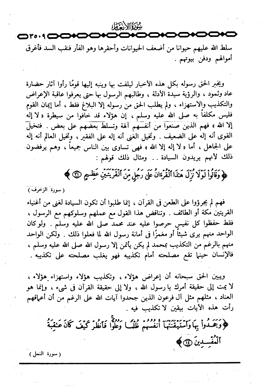 ويخبر الحق رسوله بكل هذه الأخبار ليلفت بها وينبه إليها قوماً رأوا آثار حضارة عاد وثمود، والرؤية سيدة الأدلة، وطالبهم الرسول بها حتى يعرفوا عاقبة الإعراض والتكذيب والاستهزاء، ولم يطلب الحق من رسوله إلا البلاغ فقط، أما إيمان القوم فليس مكلفاً به صَلَّى اللَّهُ عَلَيْهِ وَسَلَّم َ، إن هؤلاء قد خافوا من سيطرة «لا إله إلا الله» فهم الذين صنعوا من أنفسهم آلهة وتسلط بعضهم على بعض. فتخيل القوي أنه إله على الضعيف. وتخيل الغني أنه إله على الفقير، وتخيل العالم أنه إله على الجاهل، أما «لا إله إلا الله» فهي تساوي بين الناس جميعاً، وهم يرفضون ذلك لأنهم يريدون السيادة. . ومثال ذلك قولهم: {وَقَالُواْ لَوْلاَ نُزِّلَ هذا القرآن على رَجُلٍ مِّنَ القريتين عَظِيمٍ} [الزخرف: 31] .