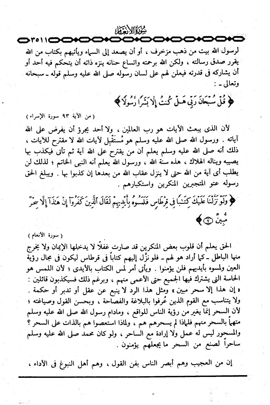 لرسول الله بيت من ذهب مزخرف، أو أن يصعد إلى السماء ويأتيهم بكتاب من الله يقرر صدق رسالته، ولكن الله برحمته واتساع حنانه ينزه ذاته أن يتحكم فيه أحد أو أن يشاركه في قدرته فيعلن لهم على لسان رسوله صَلَّى اللَّهُ عَلَيْهِ وَسَلَّم َ قوله - سبحانه وتعالى -: {قُلْ سُبْحَانَ رَبِّي هَلْ كُنتُ إِلاَّ بَشَراً رَّسُولاً} [الإسراء: 93] .