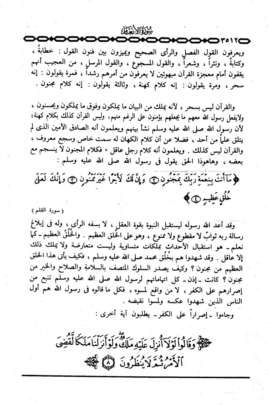 والقرآن ليس بسحر، لأنه يملك من البيان ما يملكون وفوق ما يملكون ويحسنون، ولا يفعل رسول الله معهم ما يجعلهم يؤمنون على الرغم منهم، وليس القرآن كذلك بكلام كهنة؛ لأن رسول الله صَلَّى اللَّهُ عَلَيْهِ وَسَلَّم َ نشأ بينهم ويعلمون أنه الصادق الأمين الذي لم يتلق علماً من أحد، فضلا عن أن كلام الكهان له سمت خاص وسجع معروف، والقرآن ليس كذلك. ويعلمون أنه كلام رجل عاقل، فكلام المجنون لا ينسجم مع بعضه، وها هوذا الحق يقول في رسول الله صَلَّى اللَّهُ عَلَيْهِ وَسَلَّم َ: {مَآ أَنتَ بِنِعْمَةِ رَبِّكَ بِمَجْنُونٍ وَإِنَّ لَكَ لأَجْراً غَيْرَ مَمْنُونٍ وَإِنَّكَ لعلى خُلُقٍ عَظِيمٍ} [القلم: 2 - 4] .