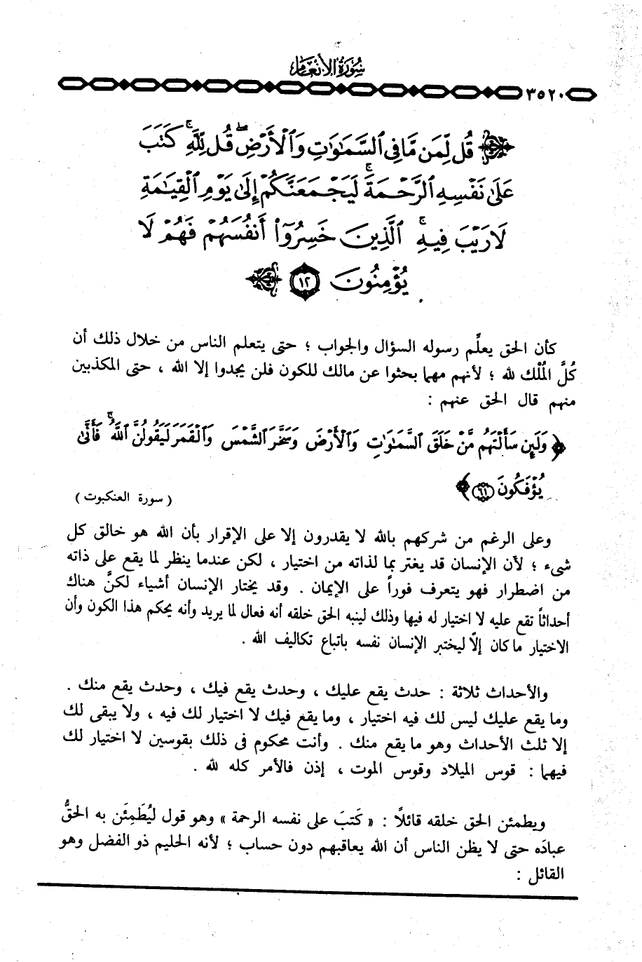 والأحداث ثلاثة: حدث يقع عليك، وحدث يقع فيك، وحدث يقع منك. وما يقع عليك ليس لك فيه اختيار، وما يقع فيك لا اختيار لك فيه، ولا يبقى لك إلا ثلث الأحداث وهو ما يقع منك. وأنت محكوم في ذلك بقوسين لا اختيار لك فيهما: قوس الميلاد وقوس الموت، إذن فالأمر كله لله.