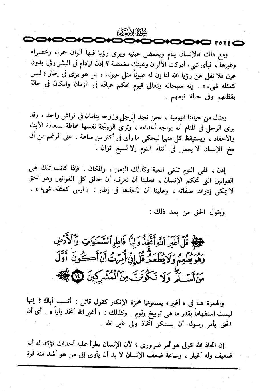 إذن، ففي النوم تُلغى المعية وكذلك الزمن، والمكان. فإذا كانت تلك هي القوانين التي تحكم الإنسان، فعلينا أن نعرف أن خالق كل القوانين وهو الحق لا يمكن إدراك صفاته، وعلينا أن نأخذها في إطار: {لَيْسَ كَمِثْلِهِ شَيْءٌ} . ويقول الحق من بعد ذلك: {قُلْ أَغَيْرَ الله ... }