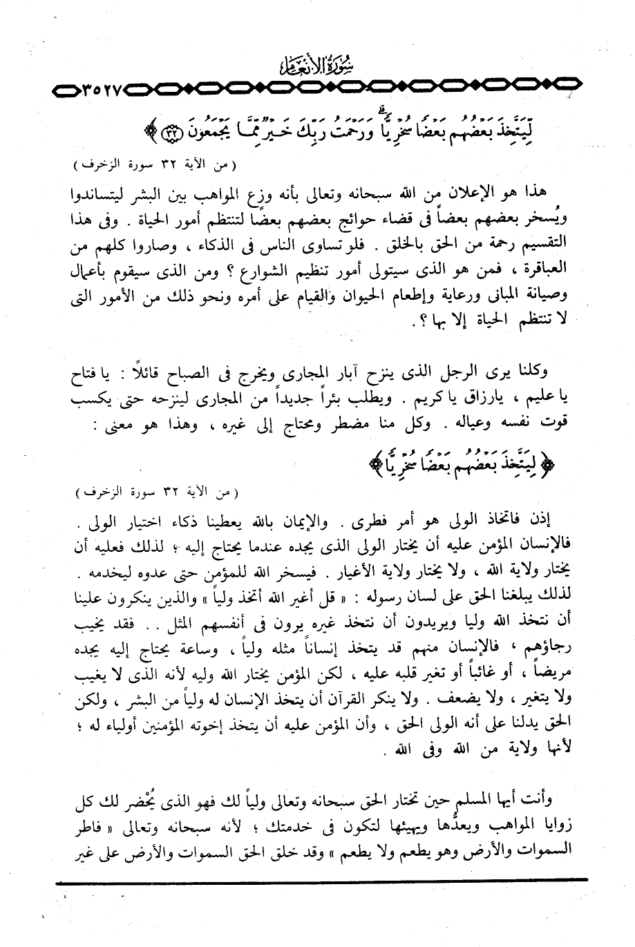وكلنا يرى الرجل الذي ينزح آبار المجاري ويخرج في الصباح قائلاً: يا فتاح يا عليم، يا رزاق كريم. ويطلب بئراً جديداً من المجاري لينزحه حتى يكسب قوت نفسه وعياله. وكل منا مضطر ومحتاج إلى غيره، وهذا هو معنى: {لِّيَتَّخِذَ بَعْضُهُم بَعْضاً سُخْرِيّاً} [الزخرف: 32] .