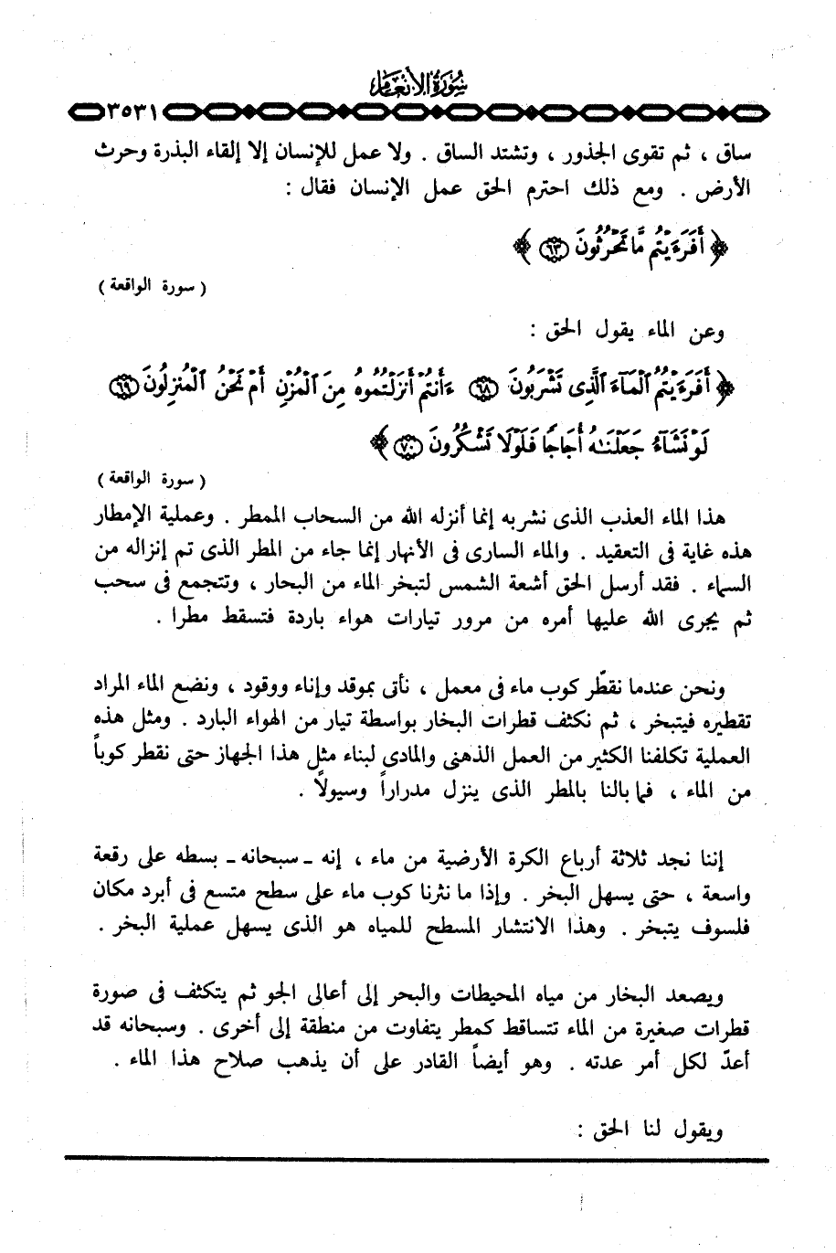 وعن الماء يقول الحق: {أَفَرَأَيْتُمُ المآء الذي تَشْرَبُونَ أَأَنتُمْ أَنزَلْتُمُوهُ مِنَ المزن أَمْ نَحْنُ المنزلون لَوْ نَشَآءُ جَعَلْنَاهُ أُجَاجاً فَلَوْلاَ تَشْكُرُونَ} [الواقعة: 68 - 70] .