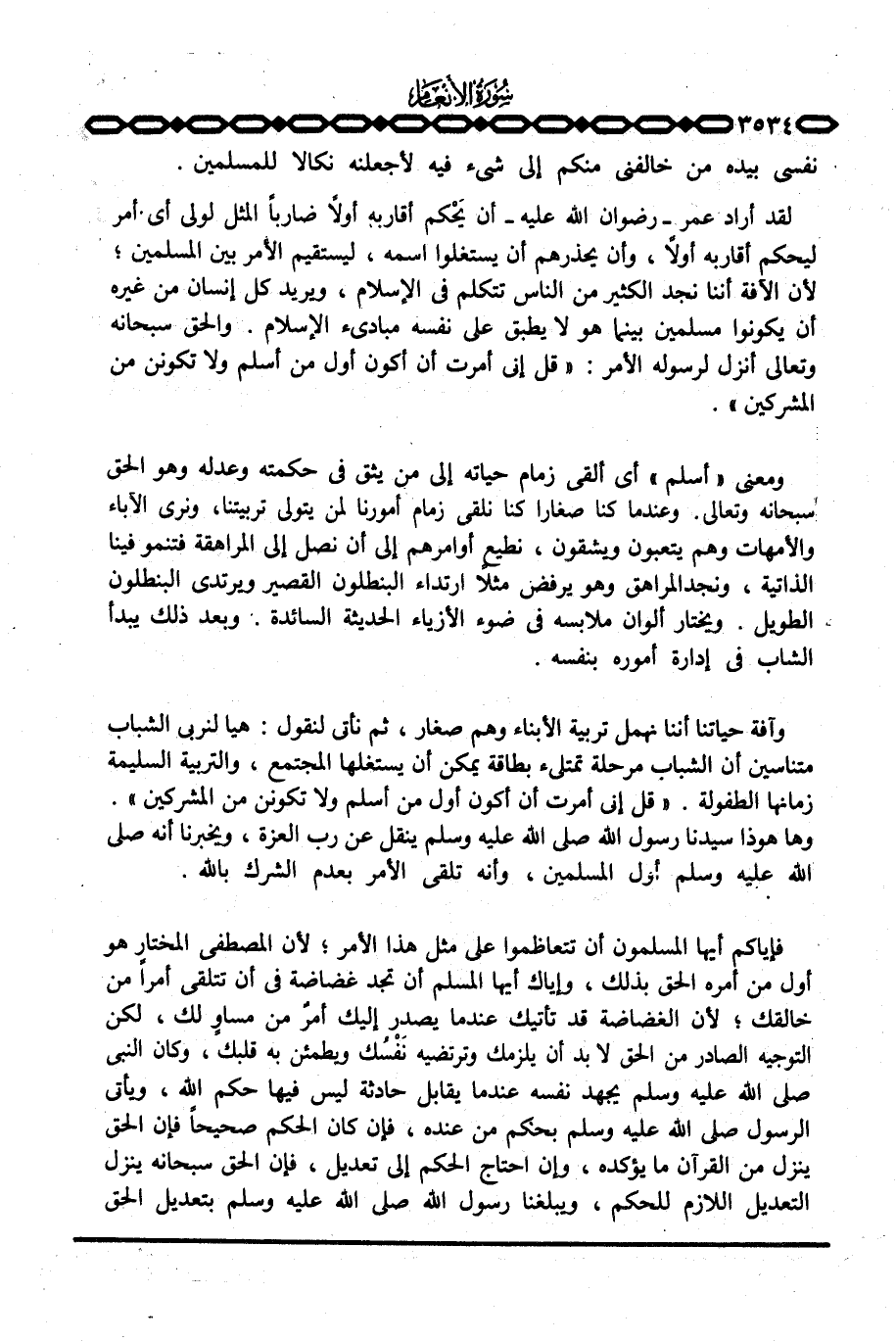 لقد أراد عمر - رضوان الله عليه - أن يَحْكم أقاربه أولاً ضارباً المثل لولي أي أمر ليحكم أقاربه أولاً، وأن يحذرهم أن يستغلوا اسمه، ليستقيم الأمر بين المسلمين؛ لأن الآفة أننا نجد الكثير من الناس تتكلم في الإسلام، ويريد كل إنسان من غيره أن يكونوا مسلمين بينما هو لا يطبق على نفسه مبادئ الإسلام. والحق سبحانه وتعالى أنزل لرسوله الأمر: {قُلْ إني أُمِرْتُ أَنْ أَكُونَ أَوَّلَ مَنْ أَسْلَمَ وَلاَ تَكُونَنَّ مِنَ المشركين} .