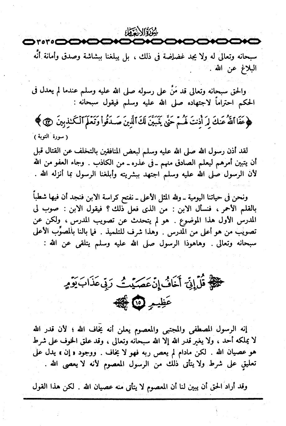 ونحن في حياتنا اليومية - ولله المثل الأعلى - نفتح كراسة الابن فنجد أن فيها شطباً بالقلم الأحمر، فنسأل الابن: من الذي فعل ذلك؟ فيقول الابن: صوب لي المدرس الأول هذا الموضوع. هو لم يتحدث عن تصويب المدرس، ولكن عن تصويب من هو أعلى من المدرس. وهذا شرف للتلميذ. فما بالنا بالمصوِّب الأعلى سبحانه وتعالى. وها هو ذا الرسول صَلَّى اللَّهُ عَلَيْهِ وَسَلَّم َ يتلقى عن الله: {قُلْ إني أَخَافُ إِنْ عَصَيْتُ ... }