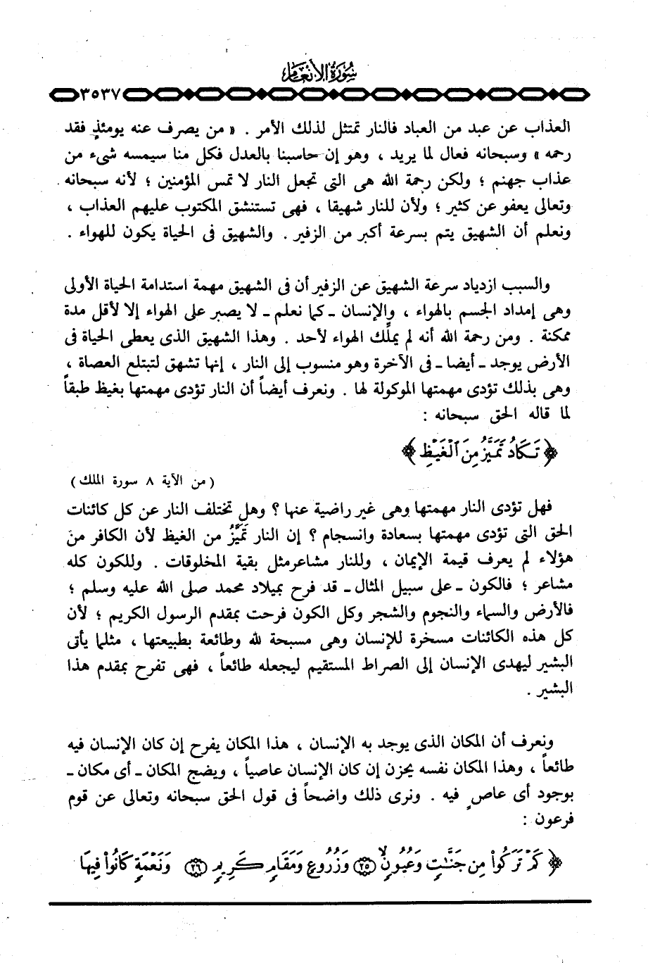 فهل تؤدي النار مهمتها وهي غير راضية عنها؟ وهل تختلف النار عن كل كائنات الحق التي تؤدي مهمتها بسعادة وانسجام؟ إن النار تَمَيَّزُ من الغيظ لأن الكافر من هؤلاء لم يعرف قيمة الإيمان، وللنار مشاعر مثل بقية المخلوقات. وللكون كله مشاعر؛ فالكون - على سبيل المثال - قد فرح بميلاد محمد صَلَّى اللَّهُ عَلَيْهِ وَسَلَّم َ؛ فالأرض والسماء والنجوم والشجر وكل الكون فرحت بمقدم الرسول الكريم؛ لأن كل هذه الكائنات مسخرة للإنسان وهي مسبحة لله وطائعة بطبيعتها، مثلما يأتي البشير ليهدي الإنسان إلى الصراط المستقيم ليجعله طائعاً، فهي تفرح بمقدم هذا البشير.
