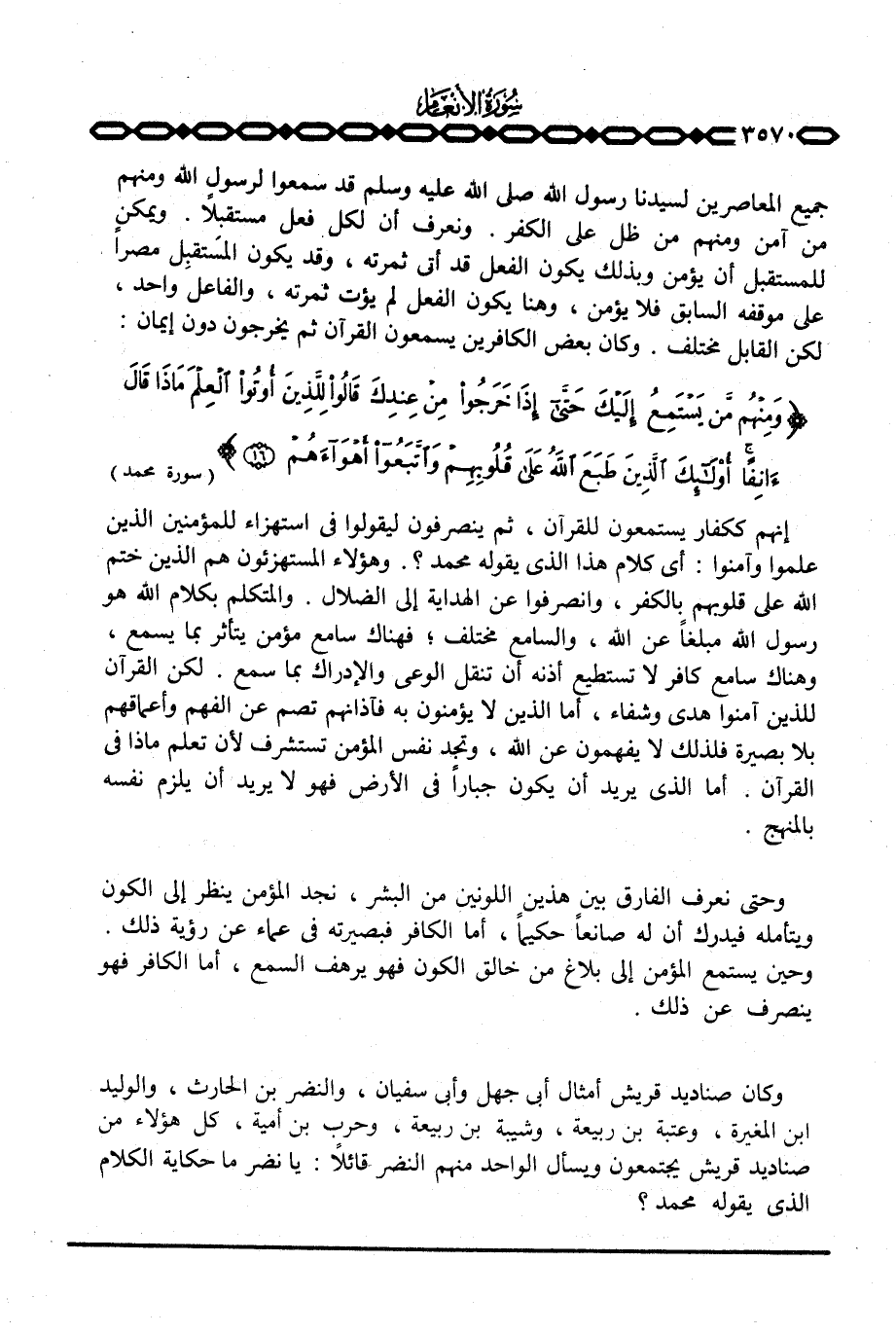 إنهم ككفار يستمعون للقرآن، ثم ينصرفون ليقولوا في استهزاء للمؤمنين الذين علموا وآمنوا: أي كلام هذا الذي يقوله محمد؟ هؤلاء المستهزئون هم الذين ختم الله على قلوبهم بالكفر، وانصرفوا عن الهداية إلى الضلال. والمتكلم بكلام الله هو رسول الله مبلغاً عن الله، والسامع مختلف؛ فهناك سامع مؤمن يتأثر بما يسمع، وهناك سامع كافر لا تستطيع أذنه أن تنقل الوعي والإدراك بما سمع. لكن القرآن للذين آمنوا هدى وشفاء، أما الذين لا يؤمنون به فآذانهم تصم عن الفهم وأعماقهم بلا بصيرة فلذلك لا يفهمون عن الله، وتجد نفس المؤمن تستشرف لأن تعلم ماذا في القرآن. أما الذي يريد أن يكون جباراً في الأرض فهو لا يريد أن يلزم نفسه بالمنهج.