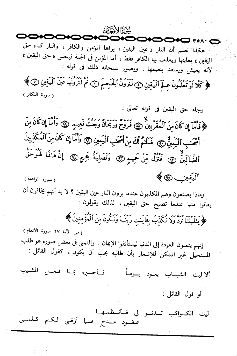هكذا نعلم أن النار «عين اليقين» يراها المؤمن والكافر، والنار ك «حق اليقين» يعانيها ويعذب بها الكافر فقط، أما المؤمن في الجنة فيحس «حق اليقين» لأنه يعيش ويسعد بنعيمها. ويصور سبحانه ذلك في قوله: {كَلاَّ لَوْ تَعْلَمُونَ عِلْمَ اليقين لَتَرَوُنَّ الجحيم ثُمَّ لَتَرَوُنَّهَا عَيْنَ اليقين} [التكاثر: 5 - 7] .