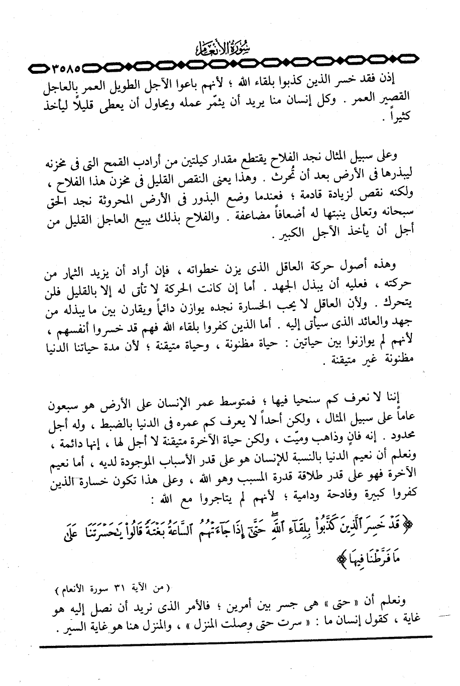 إننا لا نعرف كم ستحيا فيها؛ فمتوسط عمر الإنسان على الأرض هو سبعون عاماً على سبيل المثال، ولكن أحداً لا يعرف كم عمره في الدنيا بالضبط، وله أجل محدود. إنه فان وذاهب وميّت، ولكن حياة الآخرة متيقنة لا أجل لها، إنها دائمة، ونعلم أن نعيم الدنيا بالنسبة للإنسان هو على قدر الأسباب الموجودة لديه، أما نعيم الآخرة فهو على قدر طلاقة قدره المسبب وهو الله، وعلى هذا تكون خسارة الذين كفروا كبيرة وفادحة ودامية؛ لأنهم لم يتاجروا مع الله. {قَدْ خَسِرَ الذين كَذَّبُواْ بِلِقَآءِ الله حتى إِذَا جَآءَتْهُمُ الساعة بَغْتَةً قَالُواْ ياحسرتنا على مَا فَرَّطْنَا فِيهَا} [الأنعام: 31] .