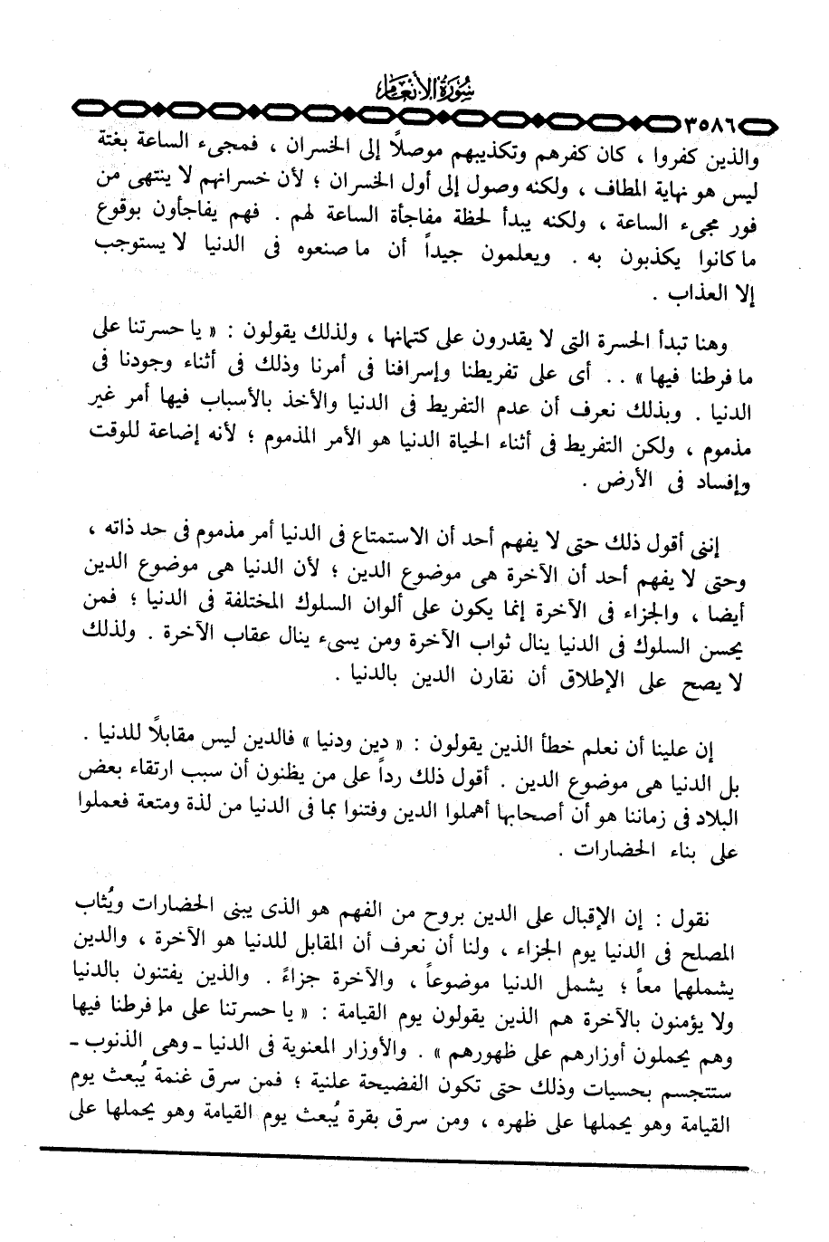 إن علينا أن نعلم خطأ الذين يقولون: «دين ودنيا» فالدين ليس مقابلاً للدنيا. بل الدنيا هي موضوع الدين. أقول ذلك رداً على من يظنون أن سبب ارتقاء بعض البلاد في زماننا هو أن أصحابها أهملوا الدين وفتنوا بما في الدنيا من لذة ومتعة فعملوا على بناء الحضارات.
