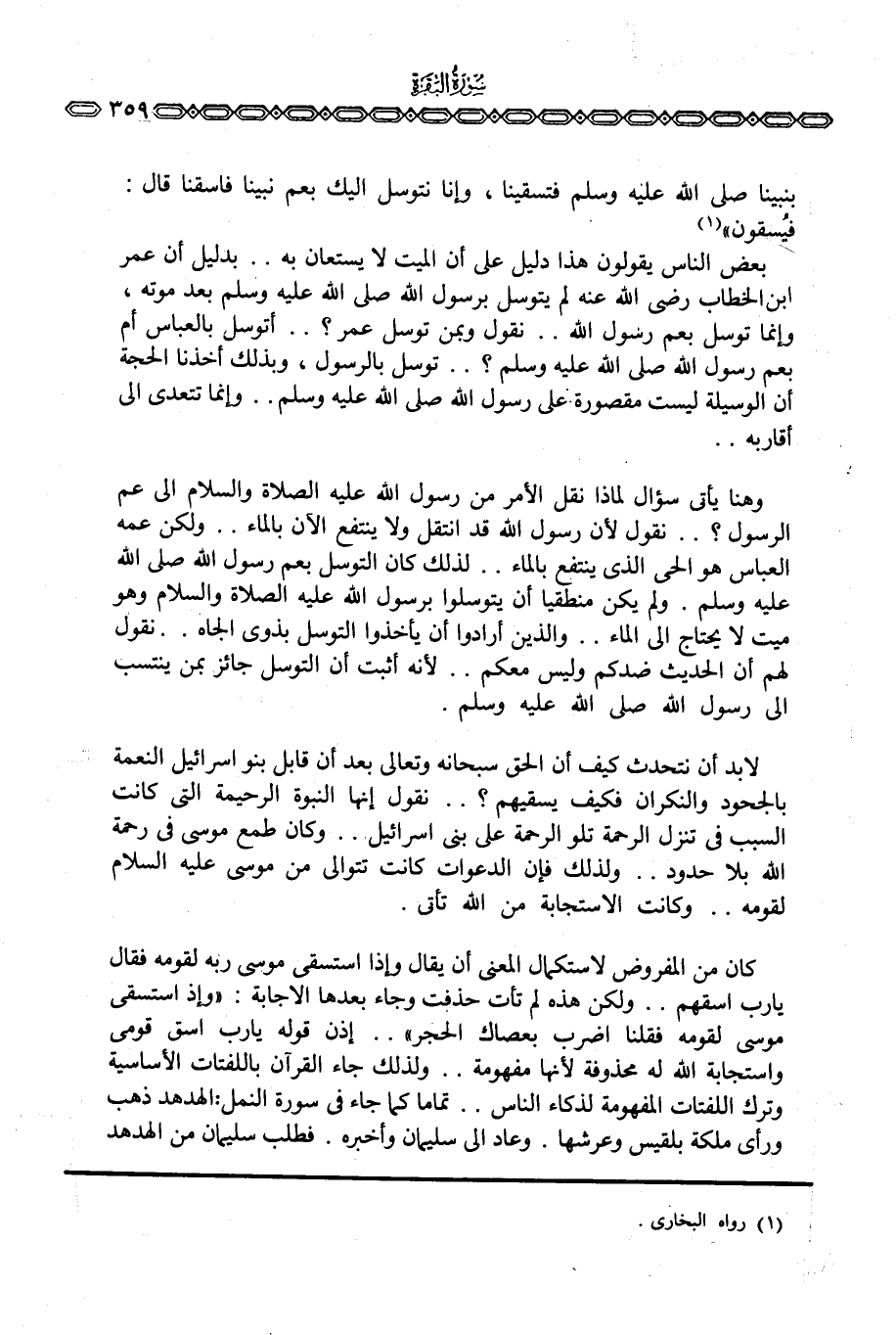 بعض الناس يقولون هذا دليل على أن الميت لا يستعان به. . بدليل أن عمر ابن الخطاب رَضِيَ اللَّهُ عَنْه لم يتوسل برسول الله صَلَّى اللَّهُ عَلَيْهِ وَسَلَّم َ بعد موته، وإنما توسل بعم رسول الله. . نقول وبمن توسل عمر؟ . . أتوسل بالعباس أم بعم رسول الله صَلَّى اللَّهُ عَلَيْهِ وَسَلَّم َ؟ . . توسل بالرسول، وبذلك أخذنا الحجة أن الوسيلة ليست مقصورة على رسول الله صَلَّى اللَّهُ عَلَيْهِ وَسَلَّم َ. . وإنما تتعدى إلى أقاربه. .
