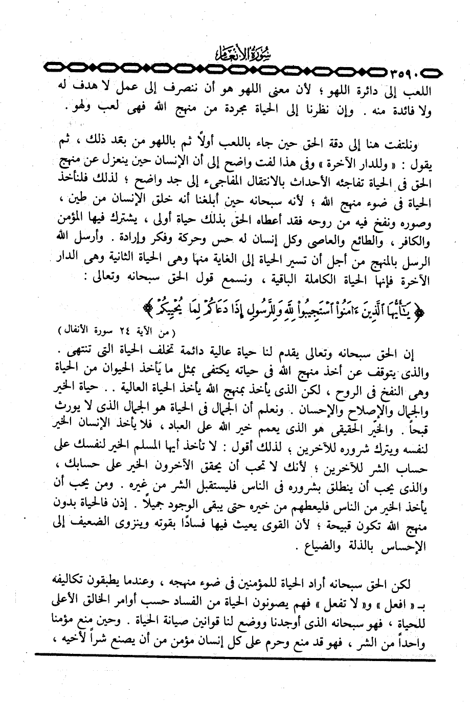 والذي يتوقف عن أخذ منهج الله في حياته يكتفي بمثل ما يَأخذ الحيوان من الحياة وهي النفخ في الروح، لكن الذي يأخذ بمنهج الله يأخذ الحياة العالية. . حياة الخير والجمال والإصْلاح والإحسان. ونعلم أن الجمال في الحياة هو الجمال الذي لا يورث قبحاً. والخير الحقيقي هو الذي يعمم خير الله على العباد، فلا يأخذ الإنسان الخير لنفسه ويترك شروره للآخرين؛ لذلك أقول: لا تأخذ أيها المسلم الخير لنفسك على حساب الشر للآخرين؛ لأنك لا تحب أن يحقق الآخرون الخير على حسابك، والذي يحب أن ينطلق بشروره في الناس فليستقبل الشر من غيره. ومن يحب أن يأخذ الخير من الناس فليعطهم من خيره حتى يبقى الوجود جميلاً. إذن فالحياة بدون منهج الله تكون قبيحة؛ لأن القوي يعيث فيها فساداً بقوته وينزوي الضعيف إلى الإحساس بالذلة والضياع.