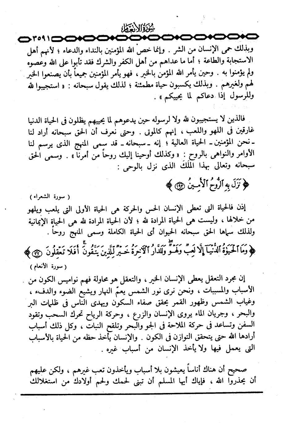 إذن فالحياة التي تعطي الإنسان الحس والحركة هي الحياة الأولى التي يلعب ويلهو من خلالها، وليست هي الحياة المرادة لله؛ لأن الحياة المرادة لله هي الحياة الإيمانية ولذلك سماها الحق سبحانه الحيوان أي الحياة الكاملة وسمى المنهج روحاً. {وَمَا الحياة الدنيآ إِلاَّ لَعِبٌ وَلَهْوٌ وَلَلدَّارُ الآخرة خَيْرٌ لِّلَّذِينَ يَتَّقُونَ أَفَلاَ تَعْقِلُونَ} [الأنعام: 32] .