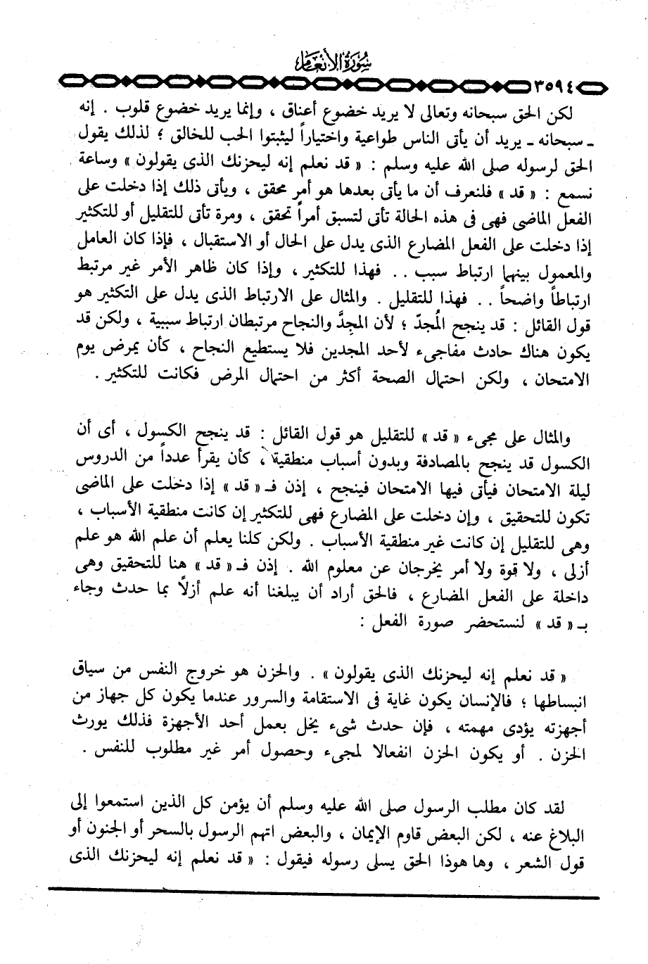لكن الحق سبحانه وتعالى لا يريد خضوع أعناق، وإنما يريد خضوع قلوب. إنه - سبحانه - يريد أن يأتي الناس طواعية واختياراً ليثبتوا الحب للخالق؛ لذلك يقول الحق لرسوله صَلَّى اللَّهُ عَلَيْهِ وَسَلَّم َ: {قَدْ نَعْلَمُ إِنَّهُ لَيَحْزُنُكَ الذي يَقُولُونَ} وساعة نسمع: «قد» فلنعرف أن ما يأتي بعدها هو أمر محقق، ويأتي ذلك إذا دخلت على الفعل الماضي فهي في هذه الحالة تأتي لتسبق أمراً تحقق، ومرة تأتي للتقليل أو للتكثير إذا دخلت على الفعل المضارع الذي يدل على الحال أو الاستقبال، فإذا كان العامل والمعمول بينهما ارتباط سبب. . فهذا للتكثير، وإذا كان ظاهر الأمر غير مرتبط ارتباطاً واضحاً. . فهذا للتقليل. والمثال على الارتباط الذي يدل على التكثير هو قول القائل: قد ينجح المُجدّ؛ لأن المجِدَّ والنجاح مرتبطان ارتباط سببية، ولكن قد يكون هناك حادث مفاجئ لأحد المجدين فلا يستطيع النجاح، كأن يمرض يوم الامتحان، ولكن احتمال الصحة أكثر من احتمال المرض فكانت للتكثير.