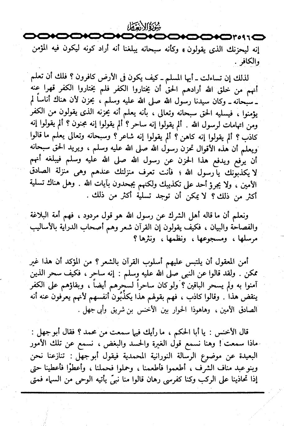 قال الأخنس: يا أبا الحكم، ما رأيك فيما سمعت من محمد؟ فقال أبو جهل: ماذا سمعت {وهنا نسمع قول الغيرة والحسد والبغض، نسمع عن تلك الأمور البعيدة عن موضوع الرسالة النورانية المحمدية فيقول أبو جهل: تنازعنا نحن وبنو عبد مناف الشرف، أطعموا فأطعمنا، وحملوا فحملنا، وأعطوْ افأعطينا حتى إذا تحاذينا على الركب وكنا كفرسي رهان قالوا منا نبيّ يأتيه الوحي من السماء فمتى