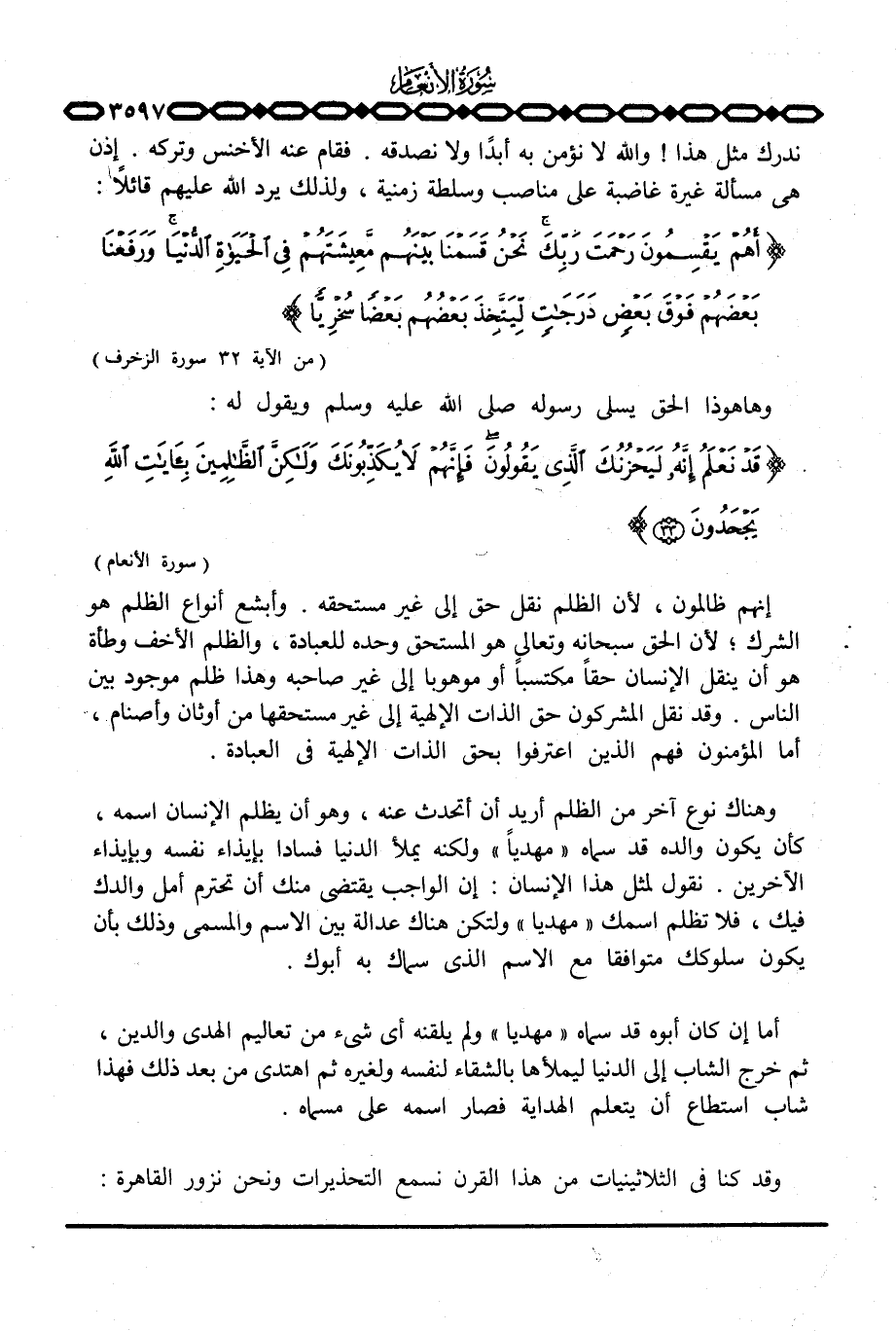 وهناك نوع آخر من الظلم أريد أن أتحدث عنه، وهو أن يظلم الإنسان اسمه، كأن يكون والده قد سماه «مهدياً» ولكنه يملأ الدنيا فساداً بإيذاء نفسه وبإيذاء الآخرين. نقول لمثل هذا الإنسان: إن الواجب يقتضي منك أن تحترم أمل والدك فيك، فلا تظلم اسمك «مهدياً» ولتكن هناك عدالة بين الاسم والمسمى وذلك بأن يكون سلوكك متوافقاً مع الاسم الذي سماك به أبوك.