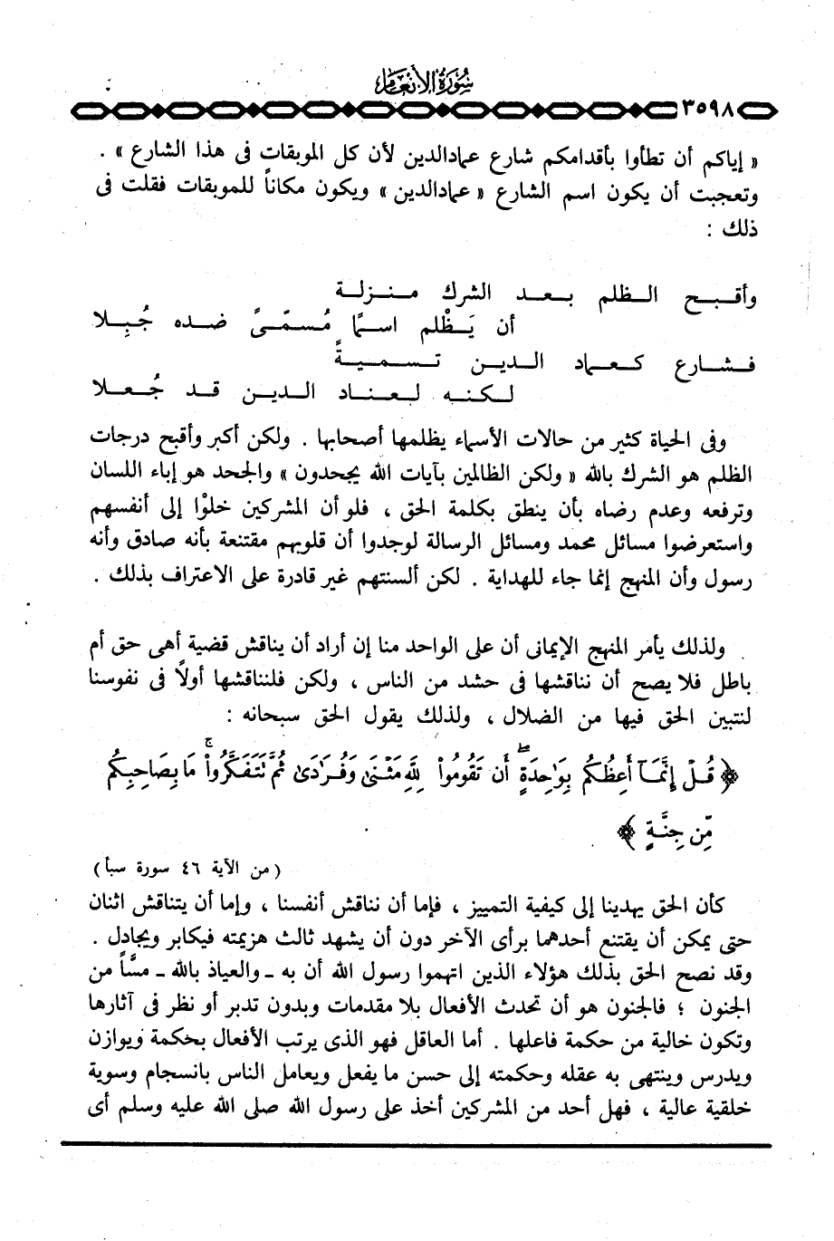 إياكم أن تطأوا بأقدامكم شارع عماد الدين لأن كل الموبقات في هذا الشارع» . وتعجبت أن يكون اسم الشارع «عماد الدين» ويكون مكاناً للموبقات فقلت في ذلك: