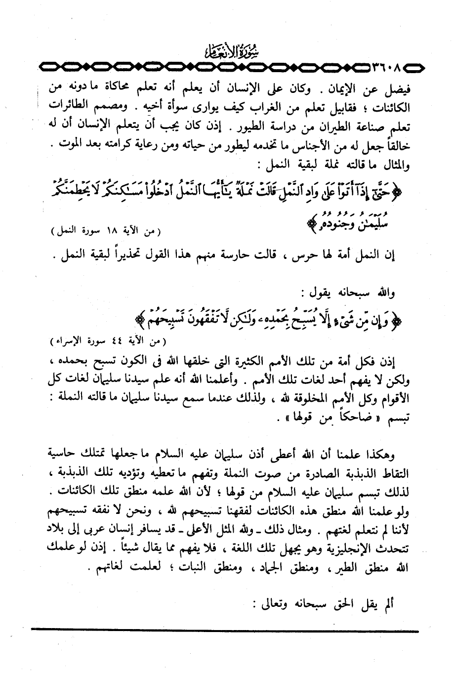 فيضل عن الإيمان. وكان على الإنسان أن يعلم أنه تعلم محاكاة ما دونه من الكائنات؛ فقابيل تعلم من الغراب كيف يواري سوأة أخيه. ومصمم الطائرات تعلم صناعة الطيران من دراسة الطيور. إذن كان يجب أن يتعلم الإنسان أن له خالقاً جعل له من الأجناس ما تخدمه ليطور من حياته ومن رعاية كرامته بعد الموت. والمثال ما قالته نملة لبقية النمل: {حتى إِذَآ أَتَوْا على وَادِ النمل قَالَتْ نَمْلَةٌ ياأيها النمل ادخلوا مَسَاكِنَكُمْ لاَ يَحْطِمَنَّكُمْ سُلَيْمَانُ وَجُنُودُهُ} [النمل: 18] .