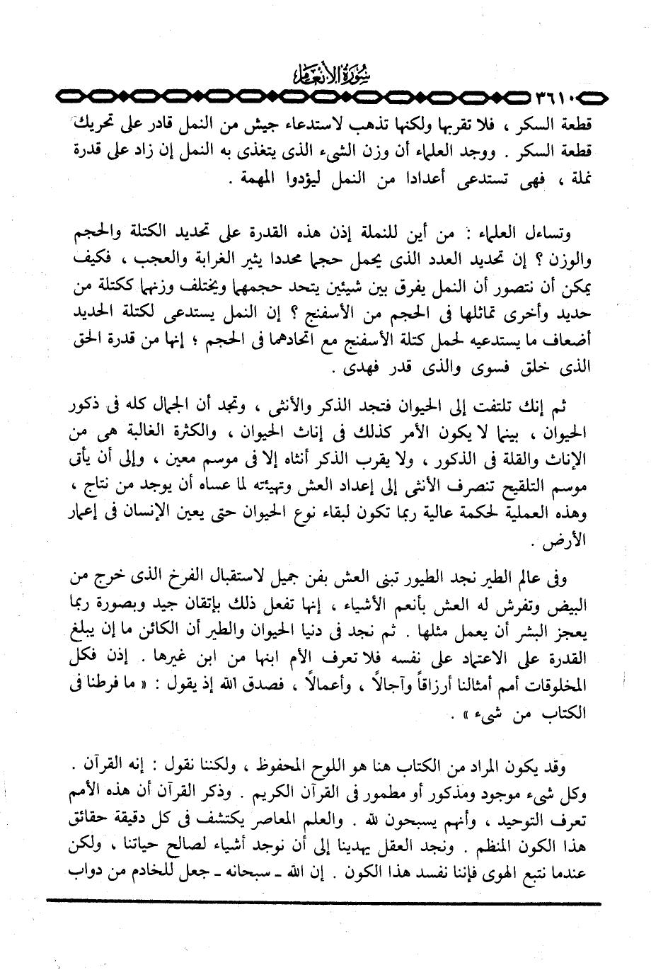 وقد يكون المراد من الكتاب هنا هو اللوح المحفوظ، ولكننا نقول: إنه القرآن، وكل شيء موجود ومذكور أو مطمور في القرآن الكريم. وذكر القرآن أن هذه الأمم تعرف التوحيد، وأنهم يسبحون لله. والعمل المعاصر يكتشف في كل دقيقة حقائق هذا الكون المنظم. ونجد العقل يهدينا إلى أن نوجد أشياء لصالح حياتنا، ولكن عندما نتبع الهوى فإننا نفسد هذا الكون. إن الله - سبحانه - جعل للخادم من دواب
