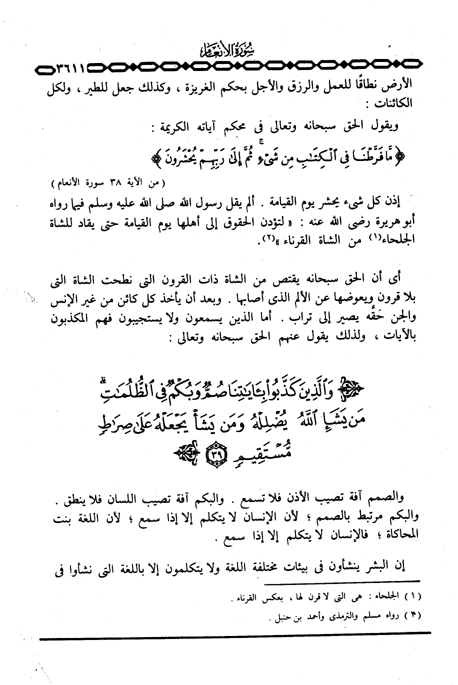 إذن كل شيء يحشر يوم القيامة. ألم يقل رسول الله صَلَّى اللَّهُ عَلَيْهِ وَسَلَّم َ فيما رواه أبو هريرة رَضِيَ اللَّهُ عَنْه: «لتؤدن الحقوق إلى أهلها يوم القيامة حتى يقاد للشاة الجلحاء من الشاة القرناء» .