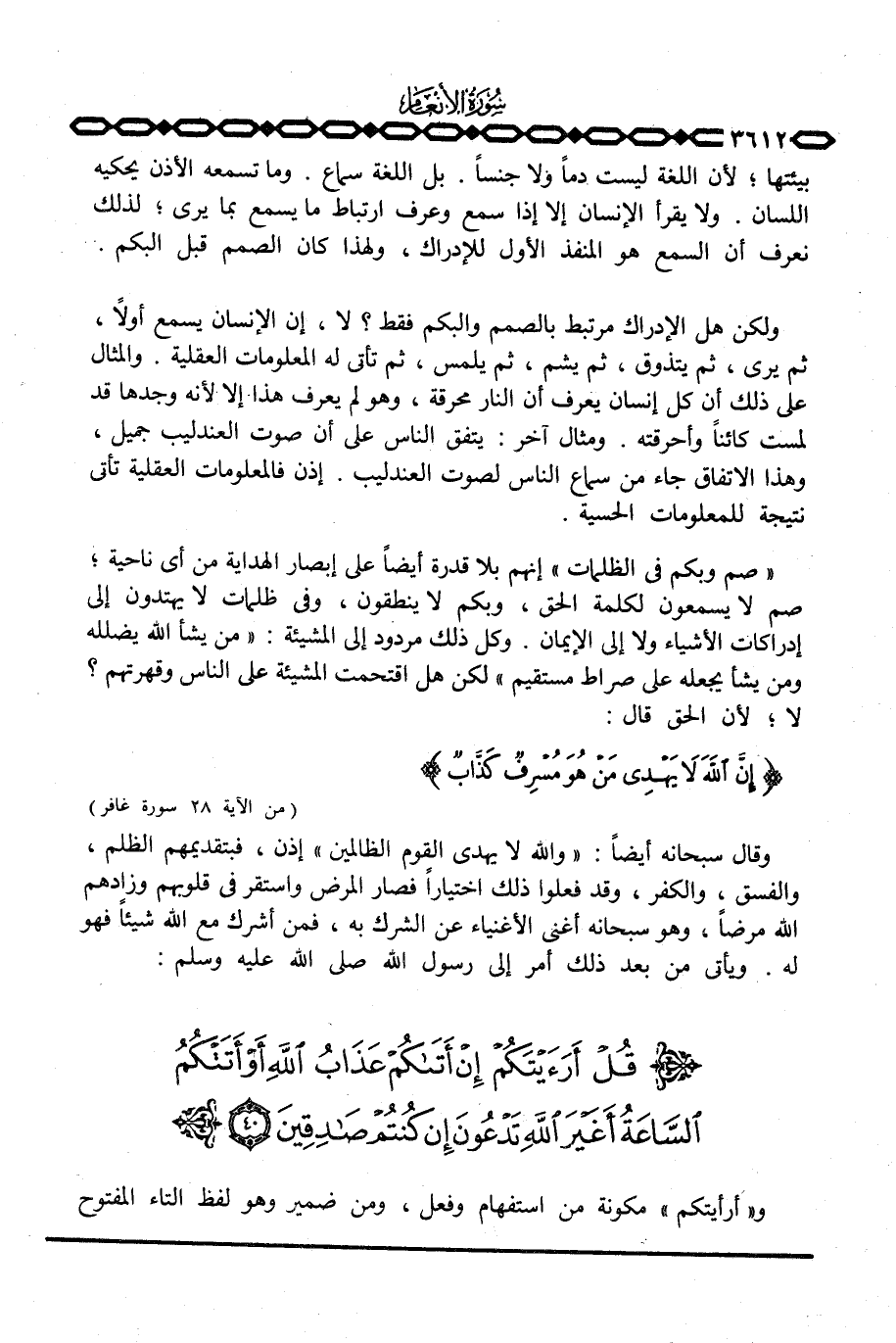 وقال سبحانه أيضاً: {والله لاَ يَهْدِي القوم الظالمين} إذن، فبتقديمهم الظلم، والفسق، والكفر، وقد فعلوا ذلك اختياراً فصار المرض واستقر في قلوبهم وزادهم الله مرضاً، وهو سبحانه أغنى الأغنياء عن الشرك به، فمن أشرك مع الله شيئاً فهو له. ويأتي من بعد ذلك أمر إلى رسول الله صَلَّى اللَّهُ عَلَيْهِ وَسَلَّم َ: {قُلْ أَرَأَيْتُكُم إِنْ أَتَاكُمْ ... }