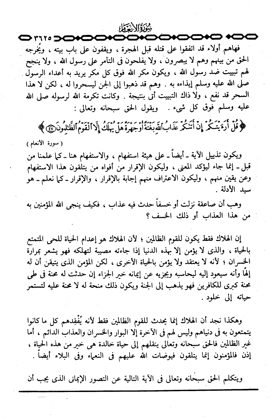 إن الهلاك فقط يكون للقوم الظالمين؛ لأن الهلاك هو إعدام الحياة للحي المتمتع بالحياة، والذي لا يؤمن إلا بهذه الدنيا إذا جاءته مصيبة لتهلكه فهو يشعر بمرارة الخسران؛ لأنه لا يعتقد ولا يؤمن بالحياة الأخرى، لكن المؤمن الذي يتيقن أن له إلهاً وأنه سيعود إليه ليحاسبه ويجزيه عن إيمانه خير الجزاء إن حدثت له محنة في طي محنة كبرى للكافرين فهو يذهب إلى الجنة ويكون ذلك منحة له لا محنة عليه لتستمر حياته إلى خلود.