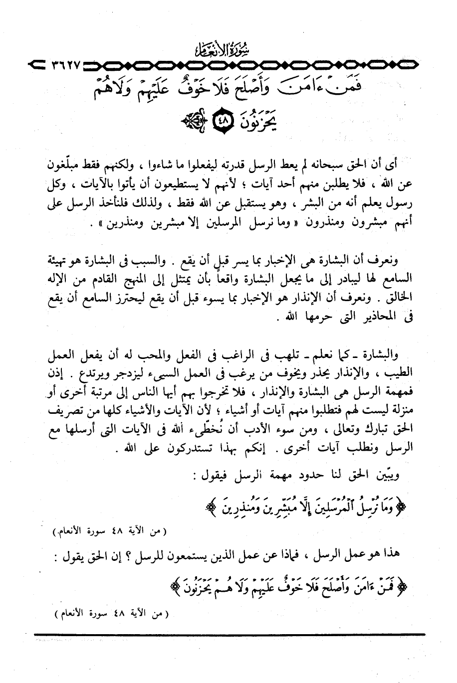 هذا هو عمل الرسل، فماذا عن عمل الذين يستمعون للرسل؟ إن الحق يقول: {فَمَنْ آمَنَ وَأَصْلَحَ فَلاَ خَوْفٌ عَلَيْهِمْ وَلاَ هُمْ يَحْزَنُونَ} [الأنعام: 48] .