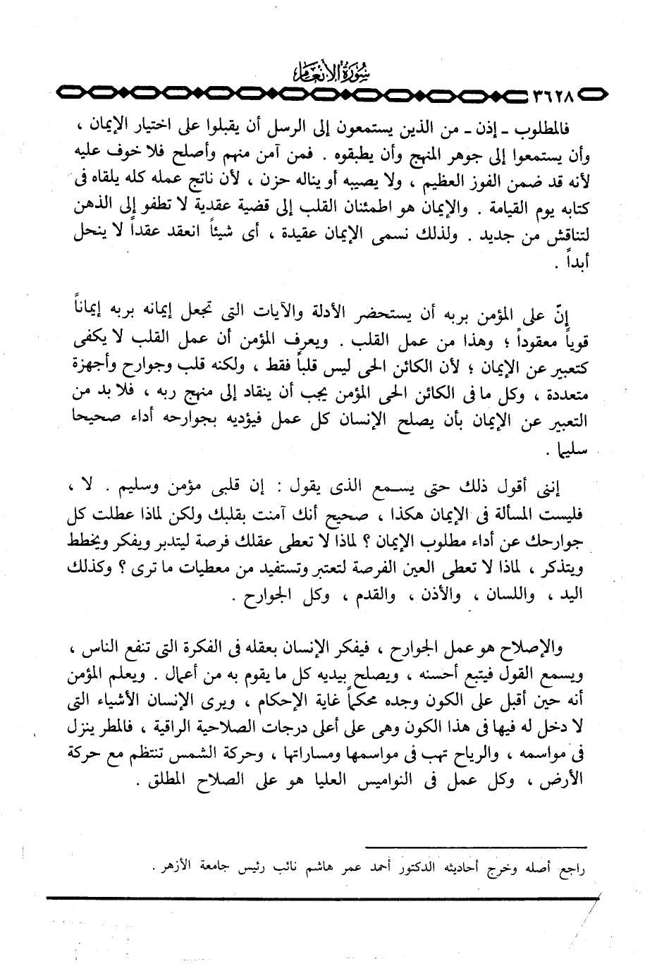 إنني أقول ذلك حتى يسمع الذي يقول: إن قلبي مؤمن وسليم. لا، فليست المسألة في الإيمان هكذا، صحيح أنك آمنت بقلبك ولكن لماذا عطلت كل جوارحك عن أداء مطلوب الإيمان؟ لماذا لا تعطي عقلك فرصة ليتدبر ويفكر ويخطط ويتذكر، لماذا لا تعطي العين فرصة لتعتبر وتستفيد من معطيات ما ترى؟ وكذلك اليد، واللسان، والأذن، والقدم، وكل الجوارح.