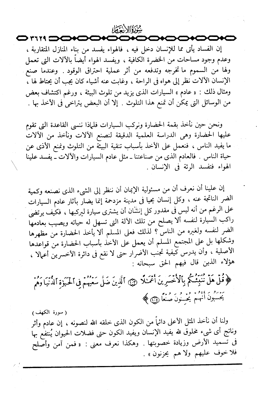 ونحن حين نأخذ بقمة الحضارة ونركب السيارات فلماذا ننسى القاعدة التي تقوم عليها الحضارة وهي الدراسة العلمية الدقيقة لنصنع الآلات ونأخذ من الآلات ما يفيد الناس، فنعمل على الأخذ بأسباب تنقية البيئة من التلوث ونمنع الأذى عن حياة الناس. فالعادم الذي من صناعتنا - مثل عادم السيارات والآلات - يفسد علينا الهواء فتفسد الرئة في الإنسان.