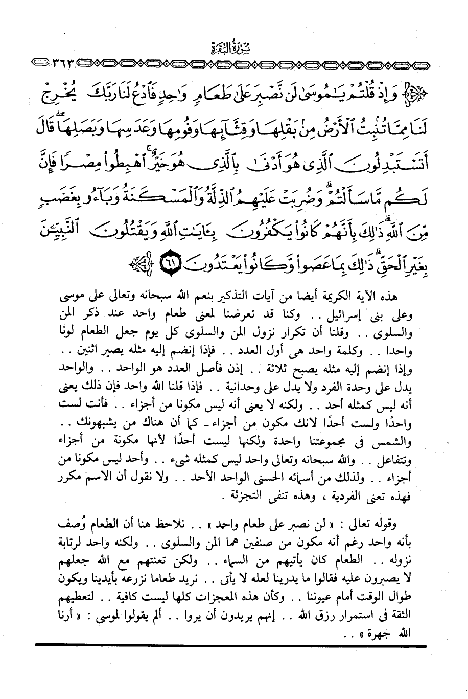 هذه الآية الكريمة أيضا من آيات التذكير بنعم الله سبحانه وتعالى على موسى وعلى بني إسرائيل. . وكنا قد تعرضنا لمعنى طعام واحد عند ذكر المن والسلوى. . وقلنا أن تكرار نزول المن والسلوى كل يوم جعل الطعام لونا واحدا. . وكلمة واحد هي أول العدد. . فإذا إنضم إليه مثله يصير اثنين. . وإذا إنضم إليه مثله يصبح ثلاثة. . إذن فأصل العدد هو الواحد. . والواحد يدل على وحدة الفرد ولا يدل على وحدانية. . فإذا قلنا الله واحد فإن ذلك يعني أنه ليس كمثله أحد. . ولكنه لا يعني أنه ليس مكونا من أجزاء. . فأنت لست واحداً ولست أحداً لأنك مكون من أجزاء كما أن هناك من يشبهونك. . والشمس في مجموعتنا واحدة ولكنها ليست أحداً لأنها مكونة من أجزاء وتتفاعل. . والله سبحانه وتعالى واحد ليس كمثله شيء. . وأحد ليس مكونا من أجزاء. . ولذلك من أسمائه الحسنى الواحد الأحد. . ولا نقول أن الاسم مكرر فهذه تعني الفردية، وهذه تنفي التجزئة.