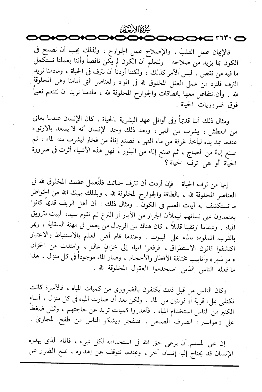 إنها من ترف الحياة. فإن أردت أن تترف حياتك فلتُعمل عقلك المخلوق لله في العناصر المخلوقة لله، بالطاقة والجوارح المخلوقة لله، وبذلك يهبك الله من الخواطر ما تستكشف به آيات العلم في الكون. ومثال ذلك: أن أهل الريف قديماً كانوا يعتمدون على نسائهم ليملأن الجرار من الآبار أو الترع ثم تقوم سيدة البيت بترويق المياه. وعندما ارتقينا قليلاً، كان هناك من الرجال من يعمل في مهنة السقاية، ويمر بالقرب المملوءة بالماء على البيوت. وعندما قام أهل العلم بالاستنباط والاعتبار اكتشفوا قانون الاستطراق، فرفعوا المياه إلى خزانٍ عالٍ، وامتدت من الخزان «مواسير» وأنابيب مختلفة الأقطار والأحجام، وصار الماء موجوداً في كل منزل، هذا ما فعله الناس الذين استخدموا العقول المخلوقة لله.