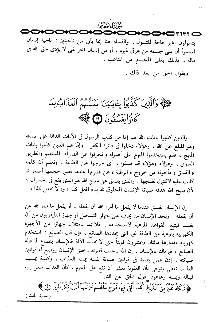 إن الإنسان يفسق عندما لا يفعل ما أمره الله أن يفعله، أو يفعل ما نهاه الله عن أن يفعله. ونجد الإنسان منا يخاف على جهاز التسجيل أو جهاز التليفزيون من أن يفسد فيتبع القواعد المرعية لاستخدامه. فلا يمد - مثلاً - جهازاً من الأجهزة الكهربية بنوعية من الطاقة غير التي يحددها الصانع، فإن قال لصانع: استخدم كهرباء مقدارها مائتان وعشرون فولتاً حتى لا تفسد الآلة فالإنسان ينصاع لما قاله الصانع، فما بالنا بالإنسان، إن الله - جلت قدرته - خلق الإنسان ووضع له قوانين صيانته. إذن فمن يفسد في قوانين صيانة نفسه يمسه العذاب، وكلمة يمسهم الذعاب تعطي وتوحي بأن العقوبة تعشق أن تقع على المجرم، كأن العذاب سعى إليه ليناله ويمسه وها هوذا قول الحق عن النار. {تَكَادُ تَمَيَّزُ مِنَ الغَيْظِ كُلَّمَا أُلْقِيَ فِيهَا فَوْجٌ سَأَلَهُمْ خَزَنَتُهَآ أَلَمْ يَأْتِكُمْ نَذِيرٌ} [الملك: 8] .